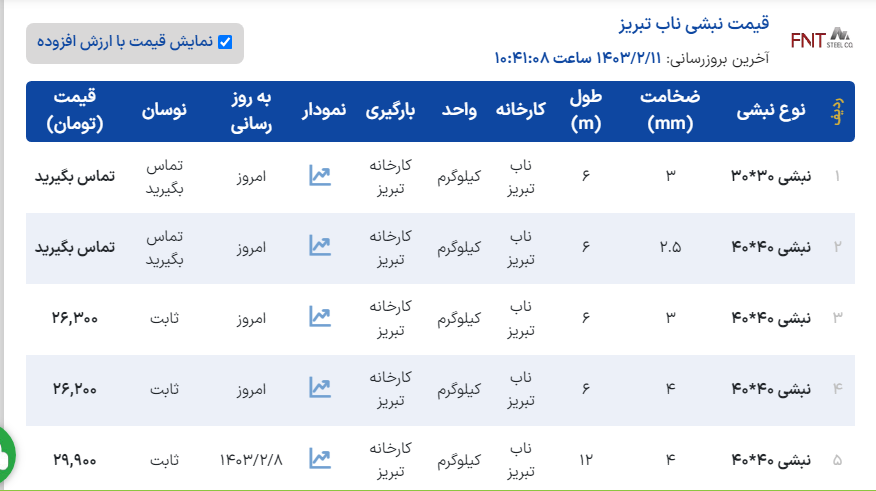 " فولاد جاوید بناب " با سلام و عرض ادب *قیمت روز سه شنبه ۱۴۰۳/۰۲/۱۱ 🔹نبشی 40*3 سبک : ۳۰۰۰۰۰ ریال 🔹نبشی 40*3 : ۲۹۰۰۰۰ ریال 🔹نبشی 40*4 سبک : ۲۹۰۰۰۰ ریال 🔹نبشی 40*4 : ۲۹۰۰۰۰ ریال 🔹نبشی 50*3 سبک : ۳۰۰۰۰۰ ریال 🔹نبشی 50*3 : ۲۸۸۰۰۰ ریال 🔹نبشی 50*4 سبک : ۲۹۰۰۰۰ ریال 🔹نبشی 50*4 : ۲۸۸۰۰۰ ریال 🔹نبشی 50*5 سبک : ۲۹۰۰۰۰ ریال 🔹نبشی 50*5 : ۲۸۸۰۰۰ ریال 🔹نبشی 60*3 : ۳۰۰۰۰۰ ریال 🔹نبشی 60*4 : ۲۹۰۰۰۰ ریال 🔹نبشی 60*5 : ۲۹۰۰۰۰ ریال 041-37780433-6 t.me/javidsteel_bonab www.javidsteel.co Telegram فولاد جاوید بناب فولاد جاوید بناب تولیدکننده انواع نبشی ومقاطع فولادی