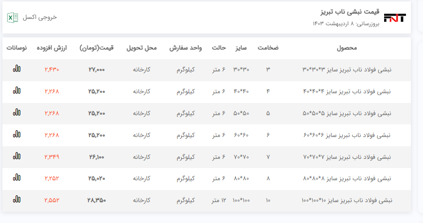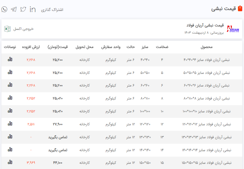 🔈قيمت #نبشي #ناوداني #سپري ساختماني در #انبار_تهران 📆1403/02/08 #نبشي نبشي ٣ سبك🔙🔙٢٩٠٠٠٠ نبشي ٣ استاندارد🔙🔙٢٩٦٠٠٠ نبشي ٤ سبك🔙🔙٢٨٦٠٠٠ نبشي ٤ استاندارد🔙🔙٢٨٢٠٠٠ نبشي ٥ فوق سبك🔙🔙٢٨٨٠٠٠ نبشي ٥ سبك🔙🔙٢٧٧٠٠٠ نبشي ٥ استاندارد🔙🔙٢٧٧٠٠٠ نبشي ٦ فوق سبك🔙🔙تماس نبشي ٦ سبك🔙🔙٢٧٧٠٠٠ نبشي ٦ استاندارد🔙🔙٢٧٧٠٠٠ نبشي ٧ سبك🔙🔙تماس نبشي ٧ استاندارد🔙🔙٢٩٢٠٠٠ نبشي ٨ سبك🔙🔙٢٨٨٠٠٠ نبشي ٨ استاندارد🔙🔙٢٧٧٠٠٠ نبشي ١٠ سبك🔙🔙تماس نبشي ١٠ استاندارد🔙🔙٢٧٧٠٠٠ نبشي ١٢ سبك🔙🔙تماس نبشي ١٢ استاندارد🔙🔙٢٨٦٠٠٠ #ناودانی ناوداني ٦ سبك 🔙🔙٢٩٧٠٠٠ ناوداني ٦ استاندارد 🔙🔙٢٩٩٠٠٠ ناوداني ٨ سبك 🔙🔙٣٠٠٠٠٠ ناوداني ٨ استاندارد 🔙🔙٢٨٧٠٠٠ ناوداني ١٠ سبك 🔙🔙٢٩١٠٠٠ ناوداني ١٠ استاندارد 🔙🔙٢٨٧٠٠٠ ناوداني ١٢ سبك 🔙🔙تماس ناوداني ١٢ استاندارد 🔙🔙٣٠٠٠٠٠ ناوداني ١٤ استاندارد 🔙🔙٢٩٣٠٠٠ ناوداني ١٦ استاندارد 🔙🔙٣٠٢٠٠٠ ناوداني ١٨ سبك 🔙🔙تماس #سپري سپري ٣ 🔙🔙٣١٠٠٠٠ سپري ٤ 🔙🔙٣٠٠٠٠٠ سپري ٥ 🔙🔙٣٠٠٠٠٠ سپري ٦ 🔙🔙٣٠٠٠٠٠ ❌براي دريافت قيمت نبشي برشي و ناوداني برشي (لقمه _گل ميخ)تماس حاصل فرماييد ❌براي دريافت قيمت نبشي و ناوداني دوازده متري تماس حاصل فرماييد 📞021-91 200 320 🔖@FardaFoolad