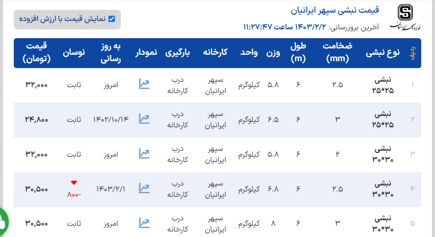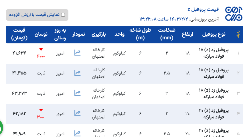 📊قيمت مبادي(كارخانه) #نبشي و #ناوداني 📆1403/02/02 نبشي ٤ نستا___٢٨٥٠٠٠ ناوداني ٨ سبك صدرا___ ناو ٨ استاندارد صدرا___٢٨٧٠٠٠ ناو ١٠ سبك صدرا___٢٩٠٠٠٠ ناو ١٠ استاندارد صدرا ___٢٨٧٠٠٠ نبشي ٤ سپهر___٢٨٥٠٠٠ نبشي ٤ سبك پارسه___٢٨٧٠٠٠ نبشي ٤ استاندارد پارسه___٢٨٢٠٠٠ نبشي ٥ فوق سبك پارسه___٢٩٥٠٠٠ نبشي ٤ سبك آريان فولاد___٢٩٤٠٠٠ نبشي ٤ استاندارد آريان فولاد ___ نبشي ٥ و ٦ و ٨ آريان فولاد ___٢٧٥٠٠٠ نبشي ١٠ و ١٢ آريان فولاد ___٢٨٥٠٠٠ نبشي ٨ اشتهارد ___ نبشي ١٠ اشتهارد ___٢٨٢٠٠٠ نبشي ١٢ صبا استيل ___ ناو ١٢ صبا استيل ___ ناو ١٤ صبا استيل ___٢٨٥٠٠٠ 📞021-91 200 320 🔖@FardaFoolad