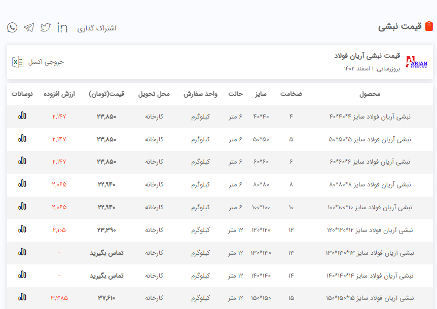 ‌‌‌‌‌‌‌‌‌‌‌‌‌‌‌‌سه‌شنبه ۰۱ / اسفند / ۱۴۰۲ 🗓 ▪️استعلام قیمت با تماس تلفنی▪️ ❇️تمامی محصولات با فاکتور رسمی ✨موجودی نبشی انبار تهران ✅نبشی ۳ اسپیرال اصفهان ( ۸ ك) ✅نبشی ۳ شکفته سنگین ( ۸ ك) ✅نبشی ۳ آی هان تهران ( ۷ ك) ✅نبشی ۳ نستا ( ۷ ك) .................................................. ✅نبشی ۴ اسپیرال اصفهان ( ۱۴ ك) ✅نبشی ۴ شکفته ( ۱۰/۵ ك) ✅نبشی ۴ شکفته سنگین( ۱۴ ك) ✅نبشی ۴ فولاد پارسه ( ۹ ك) ✅نبشی ۴ فولاد سپهر ( ۹ ك) ✅نبشی ۴ نستا ( ۹/۵ ك) ✅نبشی ۴ ابهر ( ۱۴ ك) ✅نبشی ۴ آریان فولاد ( ۱۴ ك) .................................................. ✅نبشی ۵ گ۳ شکفته ( ۱۵ ك) ✅نبشی ۵ گ ۴ زنجان ( ۱۸ ك) ✅نبشی ۵ گ ۵ زنجان ( ۲۲ ك) ✅نبشی ۵ گ ۴ آریان فولاد ( ۱۸ ك) ✅نبشی ۵ آریان فولاد ( ۲۲ ك) ✅نبشی ۵ گ ۴ ناب تبریز ( ۱۹ ك) ✅نبشی ۵ گ۴ پارسه ( ۱۸ ك) ✅نبشی ۵ گ۵ ماهان ( ۲۲ ك) ✅نبشی ۵ گ ۴ ماهان ( ۱۹ ك) .................................................. ✅نبشی ۶ گ ۵ شکفته ( ۲۷ ك) ✅نبشی ۶ گ ۵ ناب تبریز ( ۲۷ ك) ✅نبشی ۶ گ ۴ ناب تبریز ( ۲۴ ك) ✅نبشی ۶ آریان فولاد ( ۳۲ ك) ✅نبشی ۶ گ ۵ آریان فولاد ( ۲۷ ك) ✅نبشی ۶ زنجان ( ۳۱ ك) ✅نبشی ۶ گ۴ زنجان ( ۲۳ ك) ✅نبشی ۶ گ۵ زنجان ( ۲۷ ك) .................................................. ✅نبشی ۷ آریان فولاد ( ۴۴ ك) .................................................. ✅نبشی ۸ آریان فولاد ( ۵۶ ك) ✅نبشی ۸ فولاد اشتهارد ( ۵۶ ك) ✅نبشی ۸ حافظ یزد ( ۵۶ ك) ✅نبشی ۸ سدید قم ( ۵۶ ك) ✅نبشی ۸ گ۷ شکفته ( ۵۰ ك) ✅نبشی ۸ آونگان ( ۸۰ ك) .................................................. ✅نبشی ۹ گ ۸ ناب تبریز ( ۵۶ ك) .................................................. ✅نبشی ۱۰ شکفته ( ۸۰ ك) ✅نبشی ۱۰ آریان فولاد ( ۸۸ ك) ✅نبشی۱۰ اشتهارد ( ۸۶ ك) ✅نبشی۱۰ حافظ یزد ( ۸۳ ك) ✅نبشی۱۰ گ۸ اشتهارد ( ۷۵ ك) ✅نبشی۱۰ آونگان ( ۸۵ ك) .................................................. ✅نبشی ۱۲ آریان فولاد ( ۱۳۳ ك)‌ ✅نبشی ۱۲ صبا استیل ( ۱۲۳ ك)‌ ✅نبشی ۱۲ آونگان ( ۱۲۸ ك)