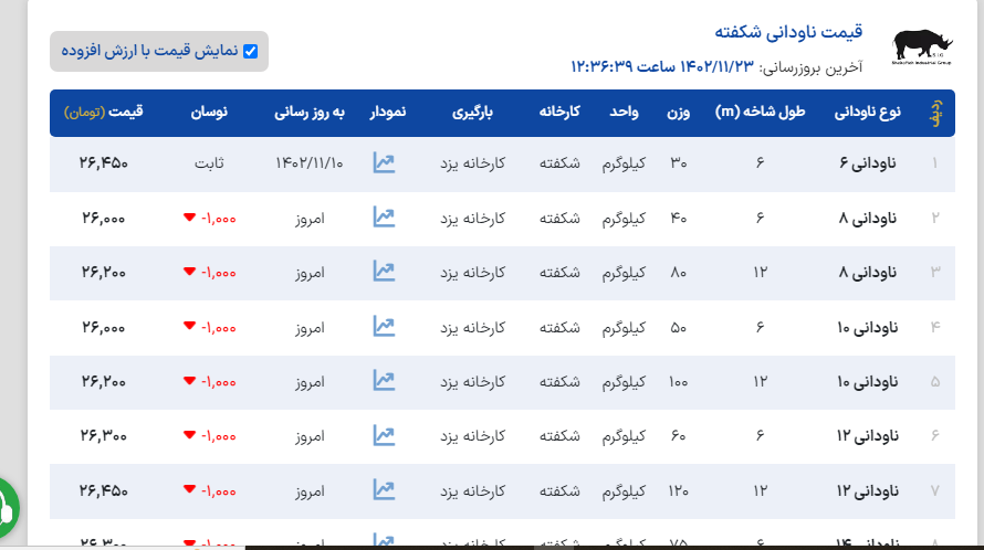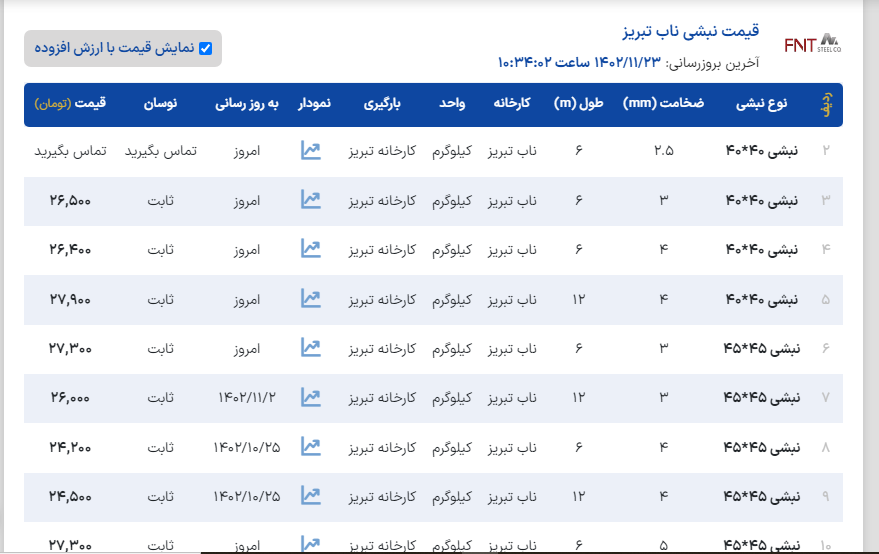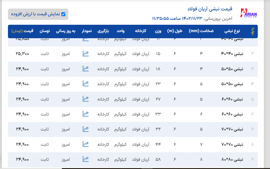 سهشنبه ۲۴ / بهمن / ۱۴۰۲ 🗓 ▪️استعلام قیمت با تماس تلفنی▪️ ❇️تمامی محصولات با فاکتور رسمی ✨موجودی نبشی انبار تهران ✅نبشی ۳ اسپیرال اصفهان ( ۸ ك) ✅نبشی ۳ شکفته سنگین ( ۸ ك) ✅نبشی ۳ آی هان تهران ( ۷ ك) ✅نبشی ۳ نستا ( ۷ ك) .................................................. ✅نبشی ۴ اسپیرال اصفهان ( ۱۴ ك) ✅نبشی ۴ شکفته ( ۱۰/۵ ك) ✅نبشی ۴ شکفته سنگین( ۱۴ ك) ✅نبشی ۴ فولاد پارسه ( ۹ ك) ✅نبشی ۴ فولاد سپهر ( ۹ ك) ✅نبشی ۴ نستا ( ۹/۵ ك) ✅نبشی ۴ ابهر ( ۱۴ ك) ✅نبشی ۴ آریان فولاد ( ۱۴ ك) .................................................. ✅نبشی ۵ گ۳ شکفته ( ۱۵ ك) ✅نبشی ۵ گ ۴ زنجان ( ۱۸ ك) ✅نبشی ۵ گ ۵ زنجان ( ۲۲ ك) ✅نبشی ۵ گ ۴ آریان فولاد ( ۱۸ ك) ✅نبشی ۵ آریان فولاد ( ۲۲ ك) ✅نبشی ۵ گ ۴ ناب تبریز ( ۱۹ ك) ✅نبشی ۵ گ۴ پارسه ( ۱۸ ك) ✅نبشی ۵ گ۵ ماهان ( ۲۲ ك) ✅نبشی ۵ گ ۴ ماهان ( ۱۹ ك) .................................................. ✅نبشی ۶ گ ۵ شکفته ( ۲۷ ك) ✅نبشی ۶ گ ۵ ناب تبریز ( ۲۷ ك) ✅نبشی ۶ گ ۴ ناب تبریز ( ۲۴ ك) ✅نبشی ۶ آریان فولاد ( ۳۲ ك) ✅نبشی ۶ گ ۵ آریان فولاد ( ۲۷ ك) ✅نبشی ۶ زنجان ( ۳۱ ك) ✅نبشی ۶ گ۴ زنجان ( ۲۳ ك) ✅نبشی ۶ گ۵ زنجان ( ۲۷ ك) .................................................. ✅نبشی ۷ آریان فولاد ( ۴۴ ك) .................................................. ✅نبشی ۸ آریان فولاد ( ۵۶ ك) ✅نبشی ۸ فولاد اشتهارد ( ۵۶ ك) ✅نبشی ۸ حافظ یزد ( ۵۶ ك) ✅نبشی ۸ سدید قم ( ۵۶ ك) ✅نبشی ۸ گ۷ شکفته ( ۵۰ ك) ✅نبشی ۸ آونگان ( ۸۰ ك) .................................................. ✅نبشی ۹ گ ۸ ناب تبریز ( ۵۶ ك) .................................................. ✅نبشی ۱۰ شکفته ( ۸۰ ك) ✅نبشی ۱۰ آریان فولاد ( ۸۸ ك) ✅نبشی۱۰ اشتهارد ( ۸۶ ك) ✅نبشی۱۰ حافظ یزد ( ۸۳ ك) ✅نبشی۱۰ گ۸ اشتهارد ( ۷۵ ك) ✅نبشی۱۰ آونگان ( ۸۵ ك) .................................................. ✅نبشی ۱۲ آریان فولاد ( ۱۳۳ ك) ✅نبشی ۱۲ صبا استیل ( ۱۲۳ ك) ✅نبشی ۱۲ آونگان ( ۱۲۸ ك) .................................................. ✨موجودی سپری انبار تهران✨ ✅سپری ۳ نورد آریا ( ۱۱ ك) ✅سپری ۴ نورد سجاد ( ۱۶ ك) ✅سپری ۴ شکفته ( ۱۵ ك) ✅سپری ۵ نورد سجاد ( ۲۳ ك ) ✅سپری ۵ شکفته ( ۲۱ ك) ✅سپری ۶ نورد آسمان ( ۲۶ ك) ✅سپری ۶ شکفته ( ۲۵ ك)