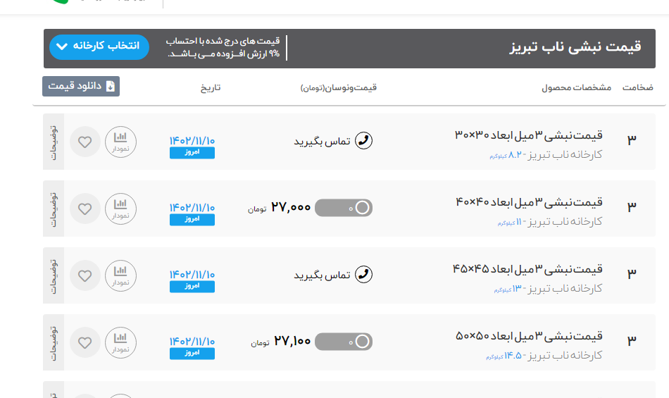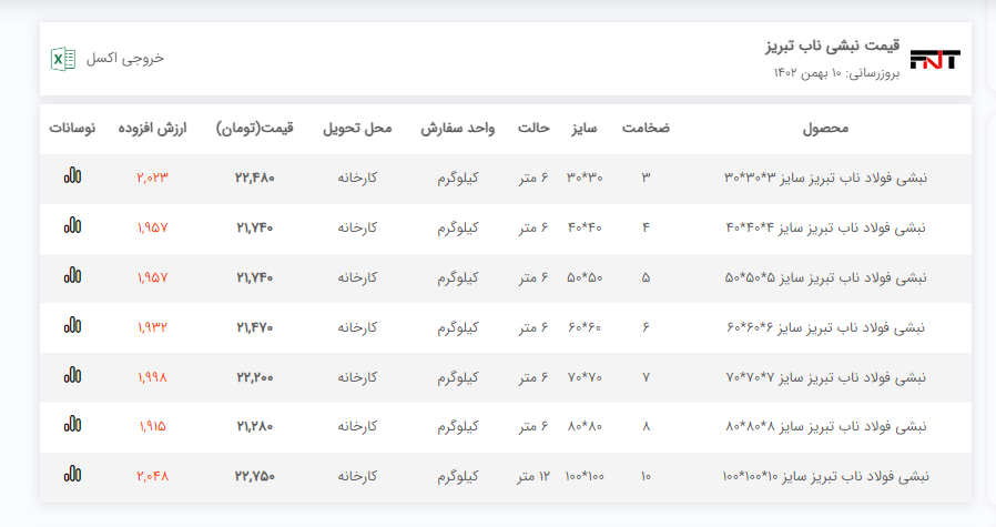 اعلام موجودی نبشی آهن یاب لیست کالای فولاد ناب تبریز : 📅 سه شنبه : ۱۴۰۲/۱۱/۱۰ (ثبات قیمت) ♦️ نبشی ۴*۴ 💵27050 تومان ♦️نبشی ۵*۵ 💵26950 تومان ♦️ نبشی۶*۶   💵25750 تومان ♦️نبشی ۷*۷ 💵26950 تومان