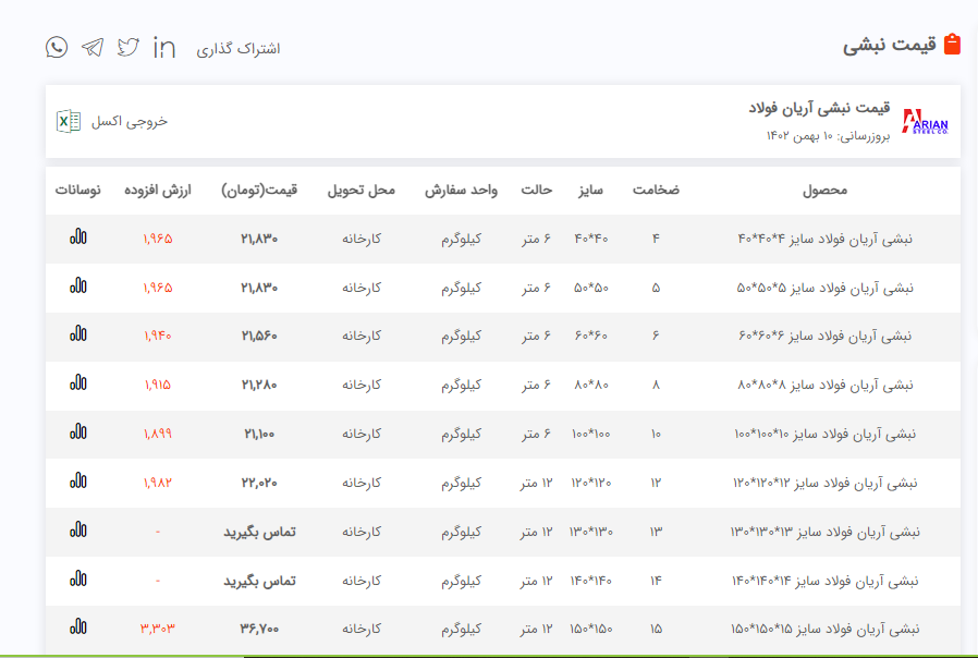 اعلام موجودی نبشی آهن یاب لیست کالای نبشی نورد آریان فولاد: 📅 سه شنبه : ۱۴۰۲/۱۱/۱۰ (افزایش قیمت) ♦️نبشی۵*۵ 💵25800 تومان 📈 300 ♦️ نبشی 6*6 💵25800 تومان 📈 300 ♦️ نبشی ۷*۷ 💵26300 تومان 📈 300 ♦️نبشی ۸*۸ 💵25800 تومان 📈 300