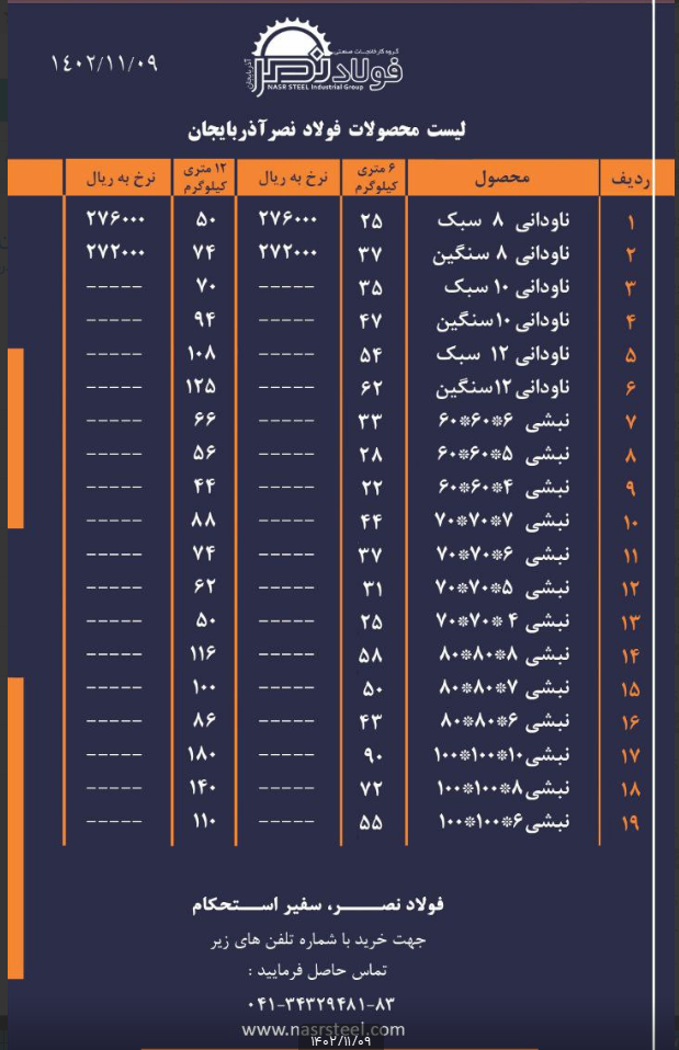 💠 گروه کارخانجات #فولاد_نصر_آذربایجان 📌تولید کننده انواع ناودانی ، نبشی و تیرآهن با استاندارد های روز دنیا 📌صادر کننده نمونه استانی #جهت_مشاهده_پروفایل_فولاد_نصر_آذربایجان👇🏻 📌https://foolad24.com/profile/12247 #جهت_مشاهده_اعلام_موجودی_فولاد_نصر_آذربایجان https://foolad24.com/profile/12247/inventory 📍آدرس کارخانه : تبریز ، جاده آذرشهر ، شهرک صنعتی سلیمی 📌تلفن های دپارتمان فروش: ☎️04134329481 ☎️04134329482 ☎️04134329483 📱09129308689 📱09144199362 🆔https://t.me/NasrsteelAZ 📌https://www.instagram.com/nasrsteel 🌐nasrsteel.com