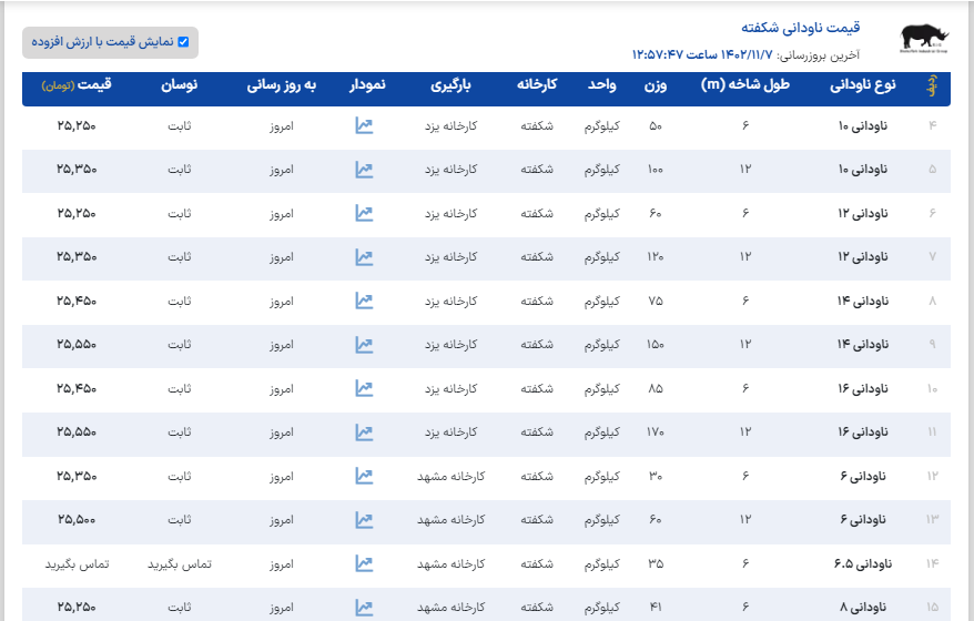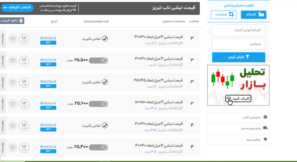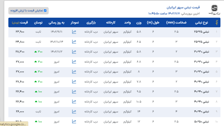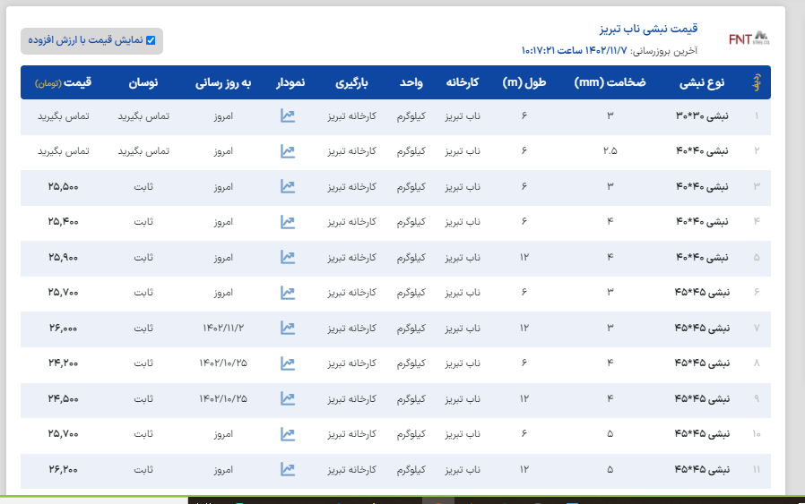اعلام موجودی نبشی آهن یاب ❇️ لیست کالای فولاد ناب تبریز : 📅 شنبه : ۱۴۰۲/۱۱/۷ (ثبات قیمت) ♦️ نبشی ۴*۴ 💵25550 تومان ♦️نبشی ۵*۵ 💵25350 تومان ♦️ نبشی۶*۶ 💵25150 تومان ♦️نبشی ۷*۷ 💵25350 تومان
