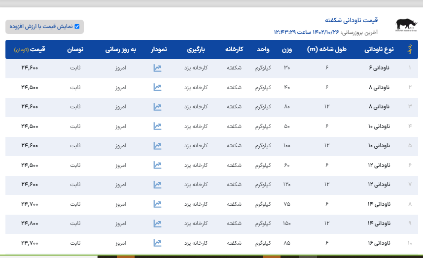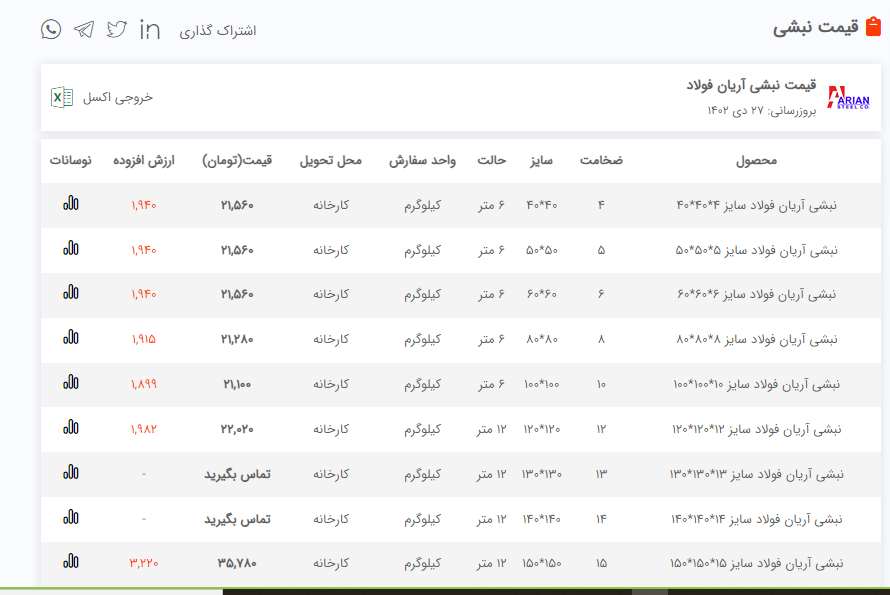 اعلام موجودی نبشی آهن یاب لیست کالای نبشی نورد آریان فولاد: 📅 سه شنبه : ۱۴۰۲/۱۰/۲۶ (افزایش قیمت) ♦️نبشی ۴*۴ 💵 24000 تومان 📈 50 ♦️نبشی۵*۵ 💵23600 تومان 📈 50 ♦️ نبشی ۷*۷ 💵23600 تومان 📈 50 ♦️نبشی ۸*۸ 💵23600 تومان 📈 50 ♦️نبشی ۱۰*۱۰ 💵24150 تومان 📈 50