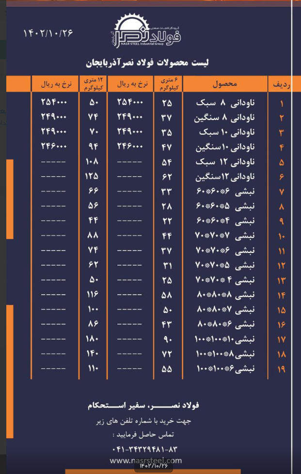 💠 گروه کارخانجات #فولاد_نصر_آذربایجان 📌تولید کننده انواع ناودانی ، نبشی و تیرآهن با استاندارد های روز دنیا 📌صادر کننده نمونه استانی #جهت_مشاهده_پروفایل_فولاد_نصر_آذربایجان👇🏻 📌https://foolad24.com/profile/12247 #جهت_مشاهده_اعلام_موجودی_فولاد_نصر_آذربایجان https://foolad24.com/profile/12247/inventory 📍آدرس کارخانه : تبریز ، جاده آذرشهر ، شهرک صنعتی سلیمی 📌تلفن های دپارتمان فروش: ☎️04134329481 ☎️04134329482 ☎️04134329483 📱09129308689 📱09144199362 🆔https://t.me/NasrsteelAZ 📌https://www.instagram.com/nasrsteel 🌐nasrsteel.com
