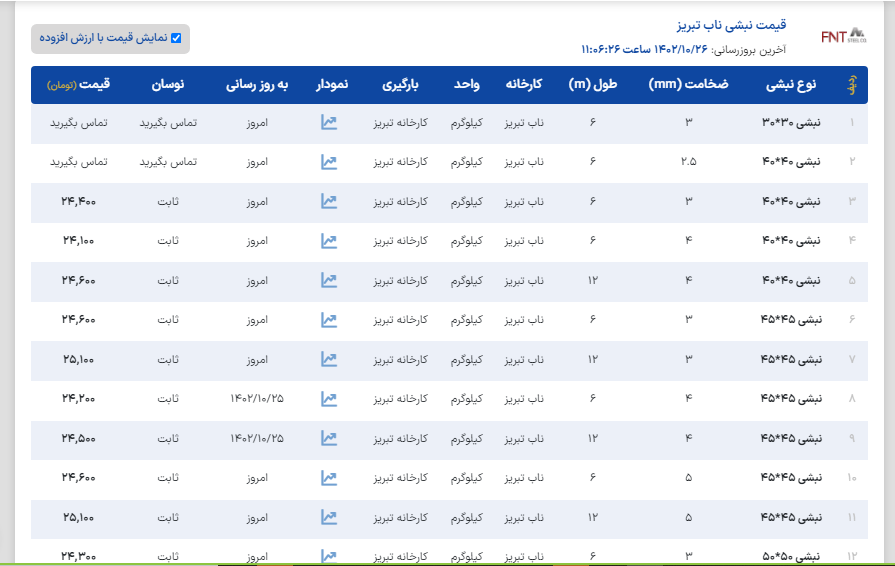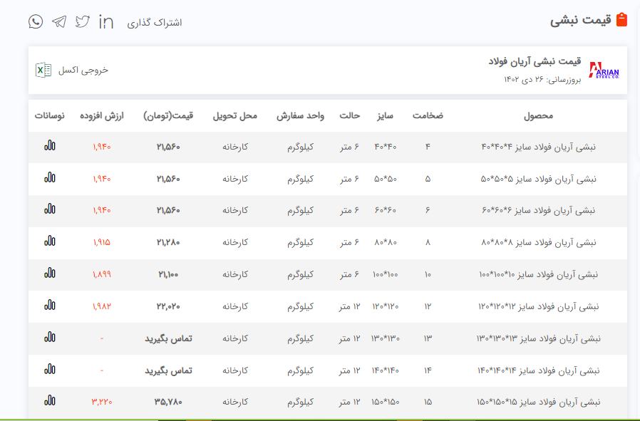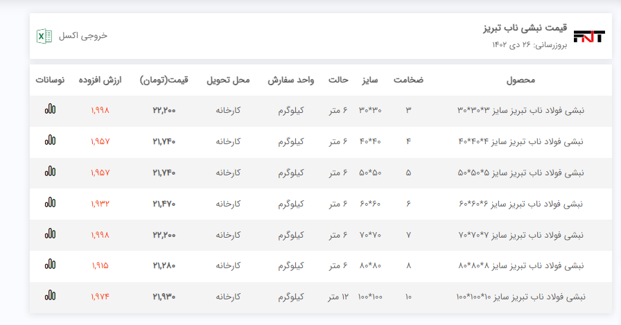 #فولاد_آذر_نبش 🔸نبشی ۳*۴: ۲۴۲۰۰۰﷼ 🔸نبشی ۴*۴: ۲۴۰۰۰۰﷼ 🔸نبشی ۳*۵ : ۲۴۰۰۰۰﷼ 🔸نبشی۴*۵: ۲۳۷۰۰۰﷼ 🔸نبشی۵*۵ : ۲۳۷۰۰۰﷼ ✅تخفیف پای آدرس 🔺افزایش۱۰۰ تومانی ☎️ 041-37731232 📱 0914-4222215 #آراد_فولاد_آذربایجان https://t.me/afa_steel