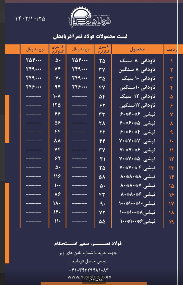 ✅ #شرکت_آسیا_فولاد_امین 🔵لیست نبشی و ناودانی🔵 ((انبار تهران)) 🔴1402/10/25🔴 #نبشی_سپهر 🔶نشی ۳ گوشت ۲/۵ سپهر:📞 #نبشی_آیهان 🔶نشی ۳ گوشت ۲/۵ آیهان:📞 #نبشي_اشتهارد 🔶نبشي 12 گوشت 12 اشتهارد:📞 🔶نبشی ۱۰ گوشت ۱۰ اشتهارد: 📞 #نبشی_پارسه 🔶نبشی ۴ گوشت ۳ پارسه : 📞 🔶نبشی ۴ گوشت ۴ پارسه : 📞 #نبشی_ظهوریان 🔶نبشی ۳ گوشت۳ ظهوریان:📞 🔶نبشی ۴ گوشت ۳ ظهوریان:📞 🔶نبشی ۵ گوشت ۳ ظهوریان:📞 🔶نبشي ٨ گوشت ۷ ظهوریان: 📞 #نبشی_شکفته 🔶نبشی ۳ گوشت ۳ شکفته:📞 🔶نبشی ۲/۵ شکفته:📞 #نبشی_آریان_فولاد 🔶نبشی ۴ گوشت ۳ آریان فولاد:📞 🔶نبشی ۴ گوشت ۴ آریان فولاد:📞 🔶نبشی۵ گوشت ۴ آریان فولاد:📞 🔶نبشی ۵ گوشت ۵ آریان فولاد:📞 🔶نبشی ۶ گوشت ۵ آریان فولاد:📞 🔶نبشی ۶ گوشت ۶ آریان فولاد:📞 🔶نبشی ۷ گوشت ۷ آریان فولاد:📞 🔶نبشی ۸ گوشت ۸ آریان فولاد:📞 🔶نبشی ۱۰ گوشت ۱۰ آریان فولاد:📞 🔶نبشی ۱۲ گوشت ۱۲ آریان فولاد:📞 🔶نبشی ۱۵ گوشت ۱۵ آریان فولاد:📞 #نبشی_دهشير_يزد 🔶نبشی 8 گوشت 8 دهشیر یزد:📞 🔶نبشی ۱۰ گوشت ۱۰ دهشیر یزد:📞 #نبشي_لقمه 🔶نبشی لقمه ۸ * ٨ :📞 🔶نبشي لقمه ١٠* ١٠ :📞