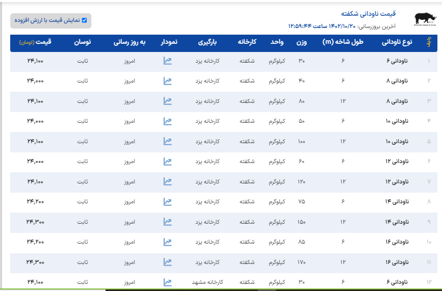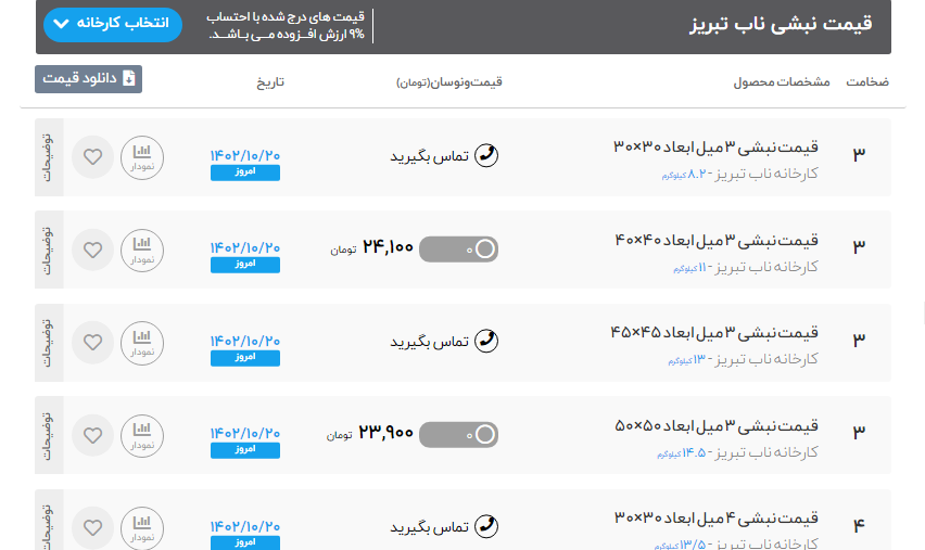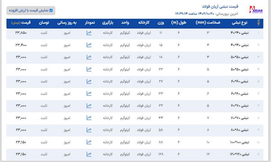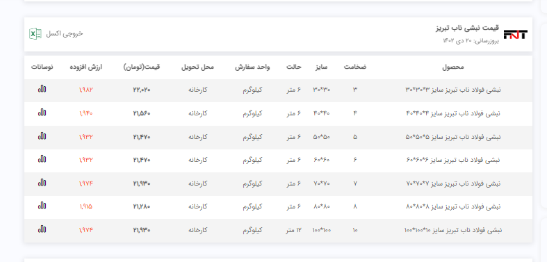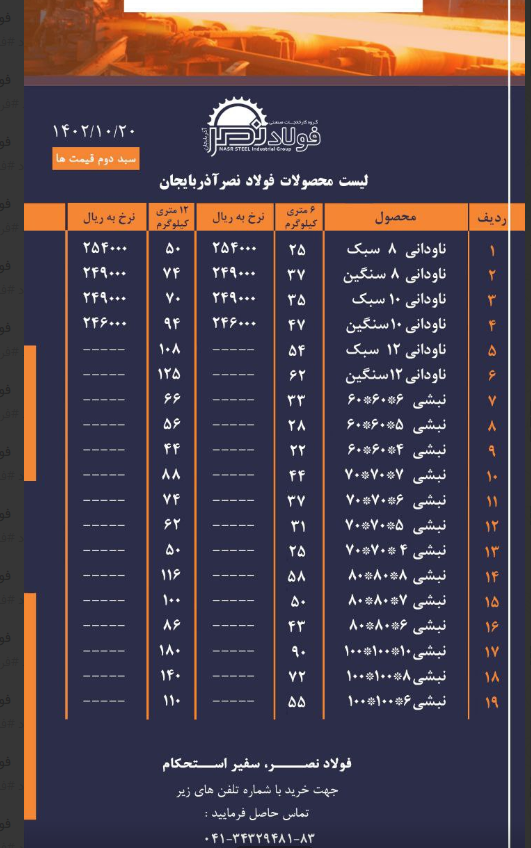 اعلام موجودی نبشی آهن یاب ❇️ لیست کالای فولاد ناب تبریز : 📅 چهارشنبه : ۱۴۰۲/۱۰/۲۰ (ثبات قیمت) ♦️ نبشی ۴*۴ 💵24050 تومان ♦️نبشی ۵*۵ 💵23850 تومان ♦️ نبشی۶*۶ 💵23850 تومان