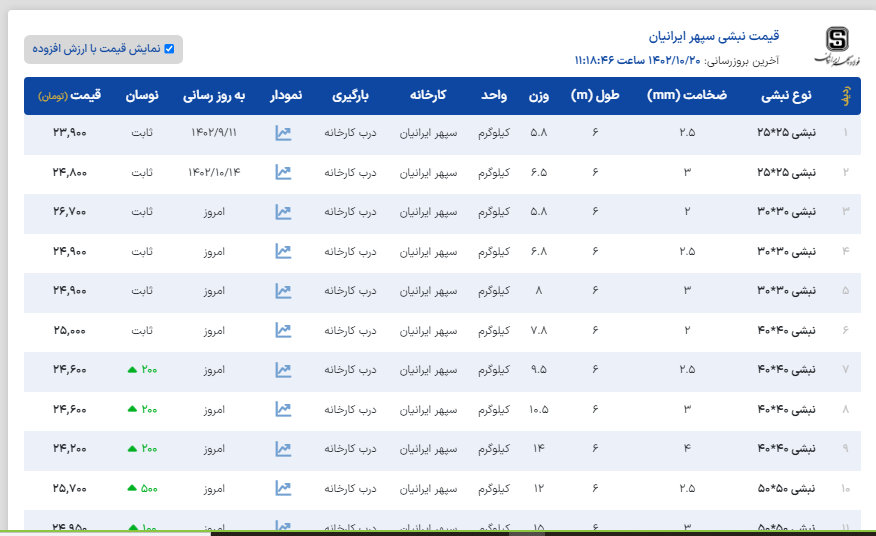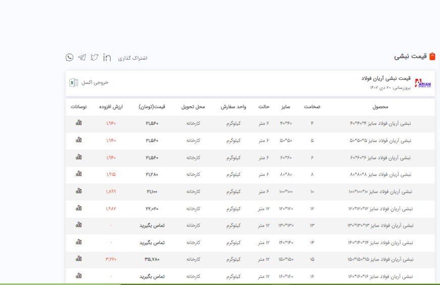 اعلام موجودی نبشی آهن یاب لیست کالای نبشی نورد آریان فولاد: 📅 چهار شنبه : ۱۴۰۲/۱۰/۲۰ (افزایش قیمت) ♦️نبشی ۴*۴ 💵 23750 تومان 📈 200 ♦️نبشی۵*۵ 💵23350 تومان 📈 200 ♦️ نبشی ۷*۷ 💵23350 تومان 📈 200 ♦️نبشی ۸*۸ 💵23350 تومان 📈 200 ♦️نبشی ۱۰*۱۰ 💵23900 تومان