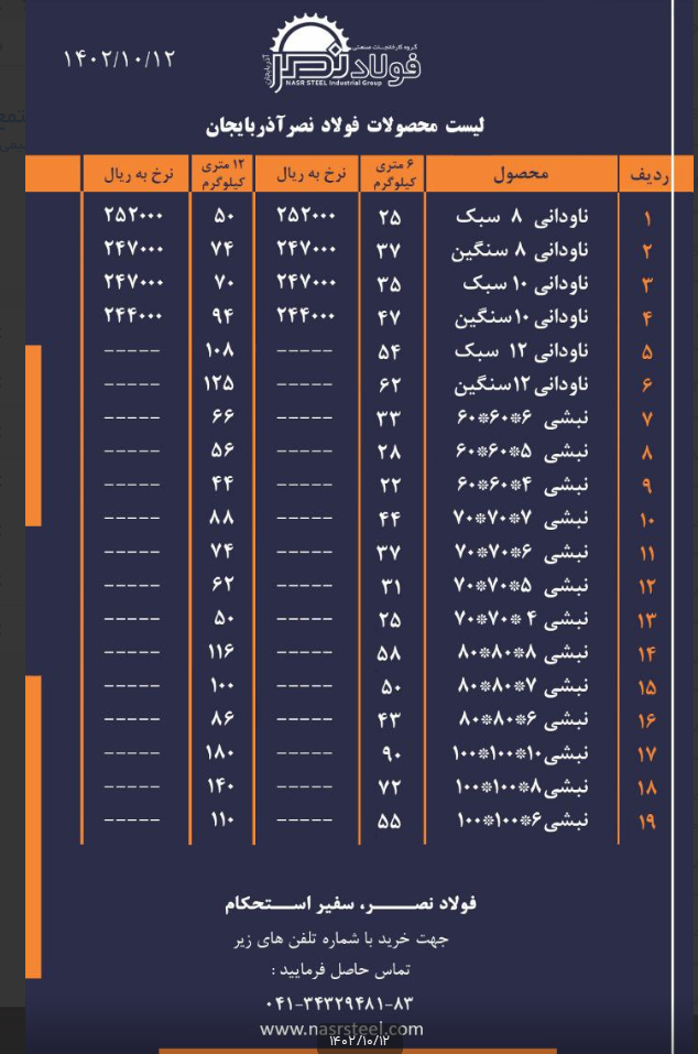 💠 گروه کارخانجات #فولاد_نصر_آذربایجان 📌تولید کننده انواع ناودانی ، نبشی و تیرآهن با استاندارد های روز دنیا 📌صادر کننده نمونه استانی #جهت_مشاهده_پروفایل_فولاد_نصر_آذربایجان👇🏻 📌https://foolad24.com/profile/12247 #جهت_مشاهده_اعلام_موجودی_فولاد_نصر_آذربایجان https://foolad24.com/profile/12247/inventory 📍آدرس کارخانه : تبریز ، جاده آذرشهر ، شهرک صنعتی سلیمی 📌تلفن های دپارتمان فروش: ☎️04134329481 ☎️04134329482 ☎️04134329483 📱09129308689 📱09144199362 🆔https://t.me/NasrsteelAZ 📌https://www.instagram.com/nasrsteel 🌐nasrsteel.com