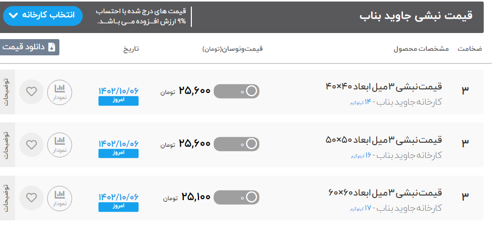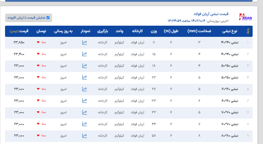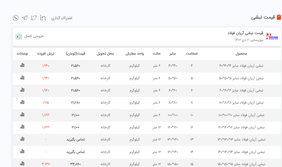 اعلام موجودی نبشی آهن یاب لیست کالای نبشی نورد آریان فولاد: 📅 چهار شنبه : ۱۴۰۲/۱۰/۶ (کاهش قیمت) ♦️نبشی ۴*۴ 💵 23500 تومان 📉 100 ♦️نبشی۵*۵ 💵23100 تومان 📉 100 ♦️ نبشی ۶*۶ 💵23100 تومان 📉 100 ♦️ نبشی ۷*۷ 💵23100 تومان 📉 100 ♦️نبشی ۸*۸ 💵23100 تومان 📉 100 ♦️نبشی ۱۲*۱۲ 💵23250 تومان 📉 100