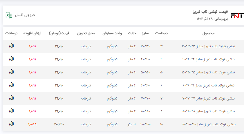 اعلام موجودی نبشی آهن یاب ❇️ لیست کالای فولاد ناب تبریز : 📅 سه شنبه : ۱۴۰۲/۹/۲۸ (ثبات قیمت) ♦️ نبشی ۴*۴ 💵23550 تومان ♦️نبشی ۵*۵ 💵23150 تومان ♦️ نبشی۶*۶ 💵23150 تومان