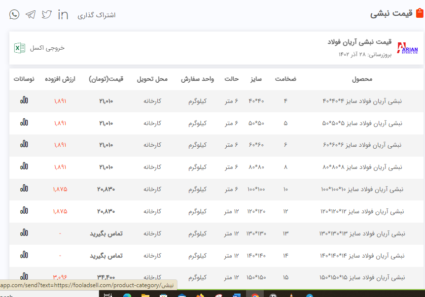 اعلام موجودی نبشی آهن یاب ❇️ لیست کالای نبشی نورد آریان فولاد: 📅 سه شنبه : ۱۴۰۲/۹/۲۸ (کاهش قیمت) ♦️نبشی ۴*۴ 💵 23700 تومان📉 200 ♦️نبشی۵*۵ 💵23300 تومان 📉 200 ♦️ نبشی ۶*۶ 💵23300 تومان 📉 200 ♦️ نبشی ۷*۷ 💵23300 تومان 📉 200 ♦️نبشی ۸*۸ 💵23300 تومان 📉 200 ♦️نبشی ۱۲*۱۲ 💵23450 تومان 📉 200