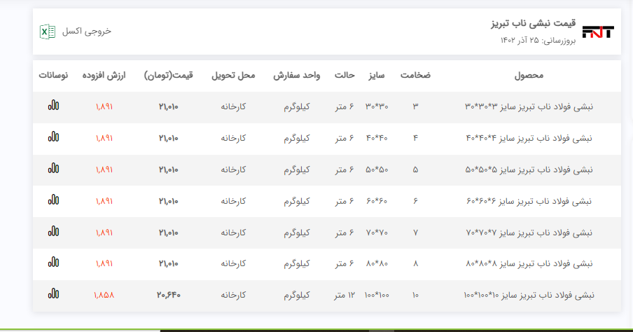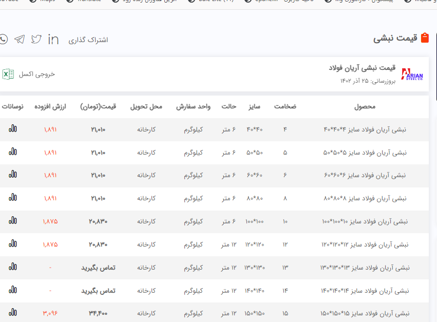 #قیمت #نبشی #آریان_فولاد #کارخانه 🌎 شنبه 25 آذر ماه 1402 🌎 طول:6متر نبشی40*40 ضخامت 3 ⏪ 241500 ریال نبشی40*40 ضخامت 4 ⏪ 236000 ریال نبشی50*50 ضخامت 4 ⏪ 236000 ریال نبشی50*50 ضخامت 5 ⏪ 236000 ریال نبشی60*60 ضخامت 6 ⏪ 236000 ریال نبشی70*70 ضخامت 7 ⏪ 236000 ریال نبشی80*80 ضخامت 8 ⏪ 236000 ریال نبشی10*10 ضخامت 10 ⏪ 237500 ریال نبشی 12*12 ضخامت 12 ⏪ 237500 ریال ✅تهران آهن خریدی امن,آسان,ارزان ✅کارشناس فروش : آقای قاجار 🔴 (https://tehran-ahan.com/) مشاهده قیمت نبشی (https://tehran-ahan.com/product-category/angel/?utm_source=telegram&utm_medium=social&utm_campaign=angel) 🔴 (https://tehran-ahan.com/)⚙️برای مشاهده کامل جدول قیمت نبشی می توانید به سایت تهران آهن مراجعه کنید: ✅(50 خط ویژه): ☎️021-86073000 📱 instagram.com/tehran.ahan 🌏 https://b2n.ir/z24424 🔗 t.me/Tehran_ahan