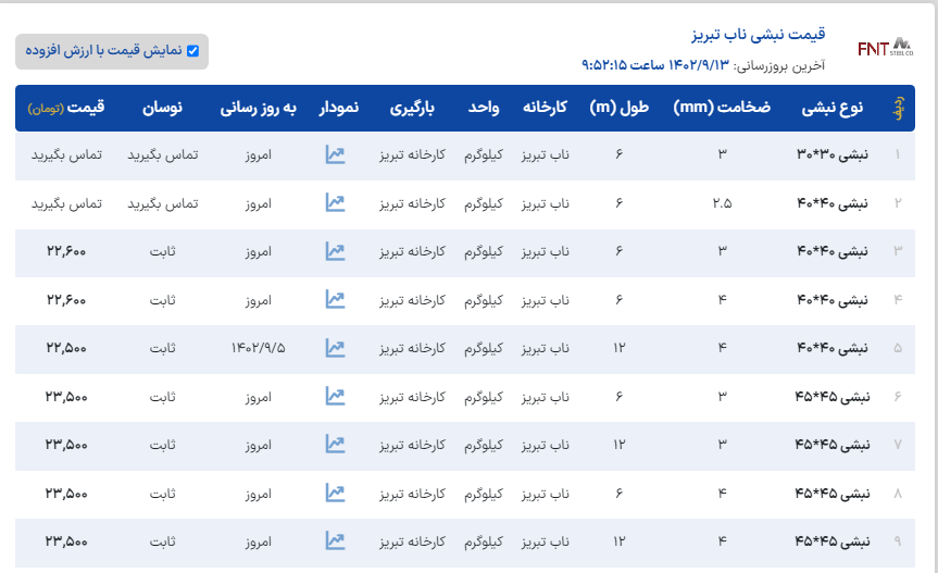 اعلام موجودی نبشی آهن یاب ❇️ لیست کالای فولاد ناب تبریز : 📅 دوشنبه : ۱۴۰۲/۹/۱۳ (ثبات قیمت) ♦️ نبشی ۴*۴ 💵22750 تومان ♦️ نبشی۶*۶ 💵22750 تومان ♦️ نبشی ۷*۷ 💵22750 تومان