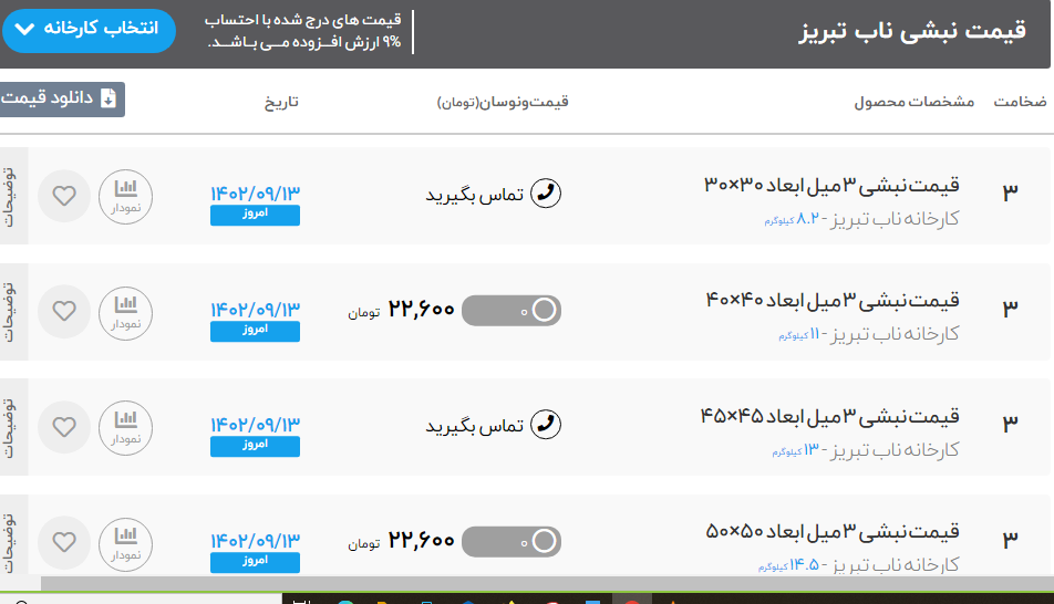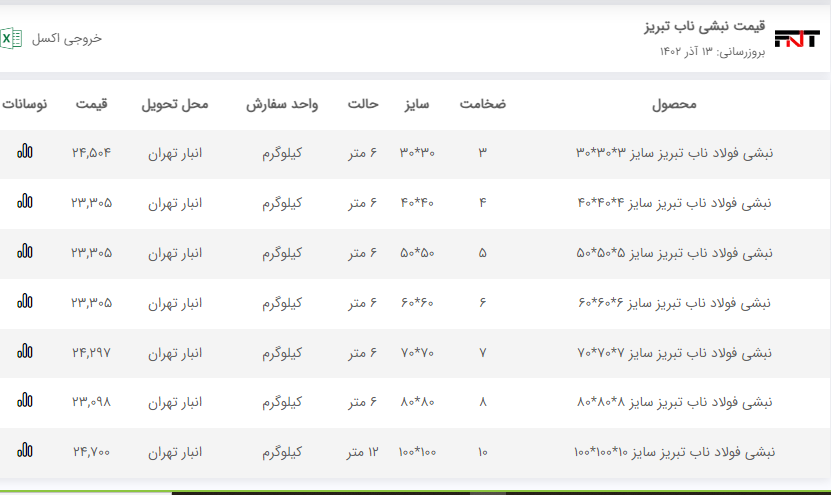 #قیمت #نبشی #ظهوریان #کارخانه 🌎 دوشنبه 13 آذر ماه 1402 🌎 طول:6متر نبشی30*30 ضخامت 3 ⏪ 234500 ریال نبشی40*40 ضخامت 4 ⏪ 232000 ریال نبشی50*50 ضخامت 5 ⏪ 232000 ریال نبشی60*60 ضخامت 6 ⏪ 234500 ریال نبشی80*80 ضخامت 8 ⏪ 231000 ریال نبشی100*100 ضخامت 10 ⏪ 231500 ریال ✅تهران آهن خریدی امن,آسان,ارزان ✅کارشناس فروش : آقای قاجار 🔴 مشاهده (https://tehran-ahan.com/) قیمت نبشی (https://tehran-ahan.com/product-category/angel/?utm_source=telegram&utm_medium=social&utm_campaign=angel) 🔴 (https://tehran-ahan.com/)⚙️برای مشاهده کامل جدول قیمت نبشی می توانید به سایت تهران آهن مراجعه کنید: ✅(50 خط ویژه): ☎️021-86073000 📱 instagram.com/tehran.ahan 🌏 https://b2n.ir/z24424 🔗 t.me/Tehran_ahan