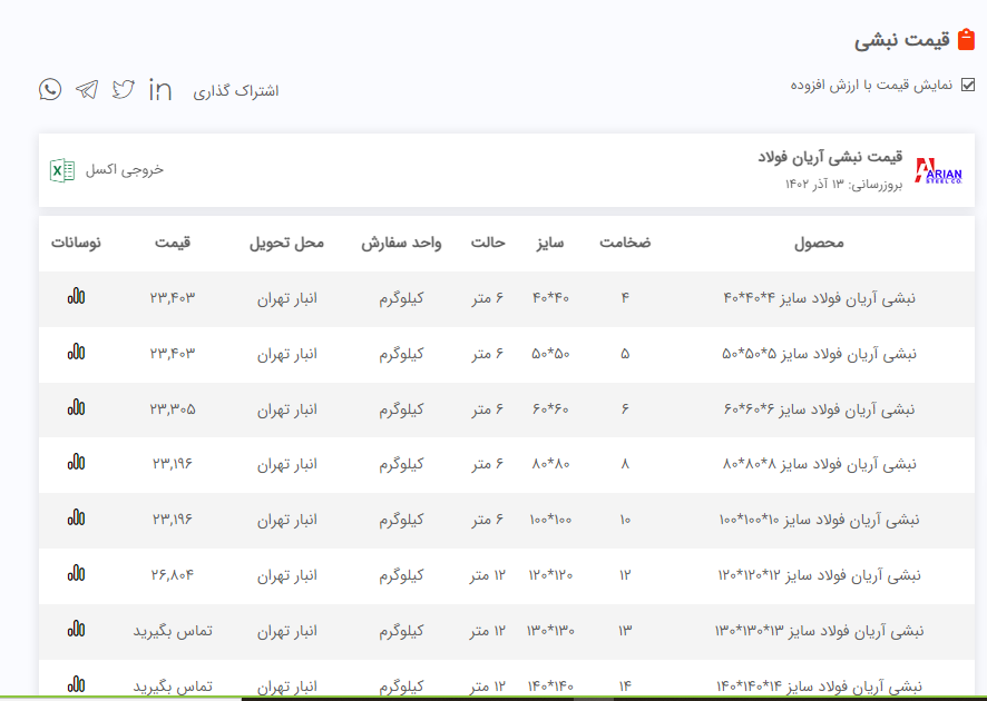 #قیمت #نبشی #آریان_فولاد #کارخانه 🌎 دوشنبه 13 آذر ماه 1402 🌎 طول:6متر نبشی40*40 ضخامت 3 ⏪ 234500 ریال نبشی40*40 ضخامت 4 ⏪ 229000 ریال نبشی50*50 ضخامت 4 ⏪ 229000 ریال نبشی50*50 ضخامت 5 ⏪ 229000 ریال نبشی60*60 ضخامت 6 ⏪ 229000 ریال نبشی70*70 ضخامت 7 ⏪ 229000 ریال نبشی80*80 ضخامت 8 ⏪ 229000 ریال نبشی10*10 ضخامت 10 ⏪ 230500 ریال نبشی 12*12 ضخامت 12 ⏪ 230500 ریال ✅تهران آهن خریدی امن,آسان,ارزان ✅کارشناس فروش : آقای قاجار 🔴 (https://tehran-ahan.com/) مشاهده قیمت نبشی (https://tehran-ahan.com/product-category/angel/?utm_source=telegram&utm_medium=social&utm_campaign=angel) 🔴 (https://tehran-ahan.com/)⚙️برای مشاهده کامل جدول قیمت نبشی می توانید به سایت تهران آهن مراجعه کنید: ✅(50 خط ویژه): ☎️021-86073000 📱 instagram.com/tehran.ahan 🌏 https://b2n.ir/z24424 🔗 t.me/Tehran_ahan
