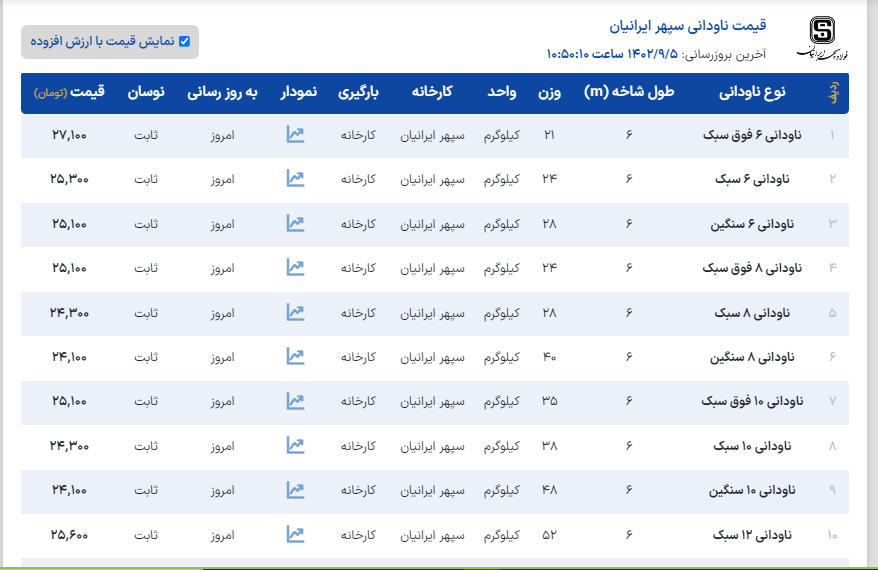 اعلام موجودی ناودانی آراد فولاد آذربایجان ✅ناودانی 🔸ناودانی 6 وزن 30 کیلو 🔸ناودانی 8وزن 40و 80کیلو 🔸ناودانی 10وزن50و100کیلو ✅سپری 🔸سپری 4وزن 15کیلو 🔸سپری 5وزن 21کیلو موجود نمی باشد. ☎️ 041-37731232 📱 0914-4222215