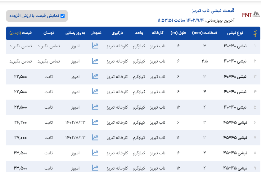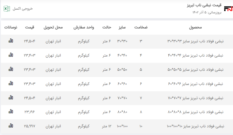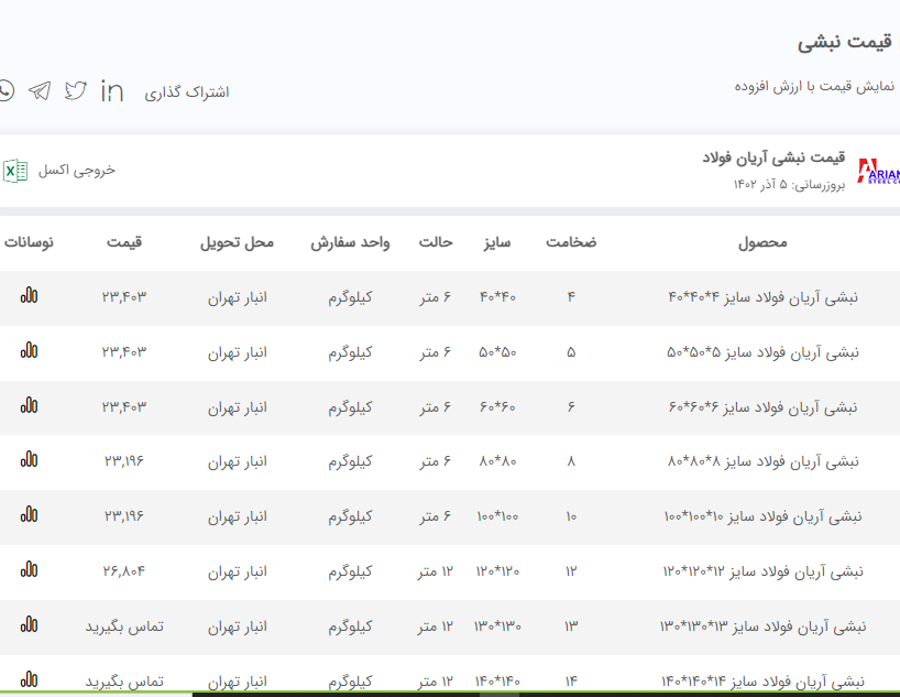 📋 لیست قیمت #نبشی بروزرسانی شد. 🗓یکشنبه 5 آذر ۱۴۰۲ شکفته نبشی 4 سنگین 25800 ۶متری نبشی 5 سنگین 25800 ۶متری نبشی 6 سنگین 25800 ۶متری نبشی 8 سنگین 26600 ۶متری تبریز نبشی 4 سنگین 25800 ۶متری نبشی 5 سنگین 25800 ۶متری نبشی 6 سنگین 25800 ۶متری نبشی 8 سنگین 26600 ۶متری اشتهارد نبشی 4 سنگین 25700 ۶متری نبشی 5 سنگین 25700 ۶متری نبشی 6 سنگین 25700 ۶متری نبشی 8 سنگین 26500 ۶متری قیمتهای بروز #نبشی: https://ahanbazar.com/product-category/corner/ 🔵 Website www.ahanbazar.com ⚫️Telegram:@ahanbaazar 🔴 Instagram : https://instagram.com/ahanbazar ☎️ تلفن : 021 - 55445622 021 - 55445623 🔶 تهران - اتوبان آزادگان - بازار آهن مکان - خ ششم غربی- پلاک 1622 📉📈 به علت نوسانات قیمت در بازارآهن، در صورت اقدام به خرید, گرفتن تأییدیه قیمت از دفتر فروش #آهن_بازار الزامی میباشد.