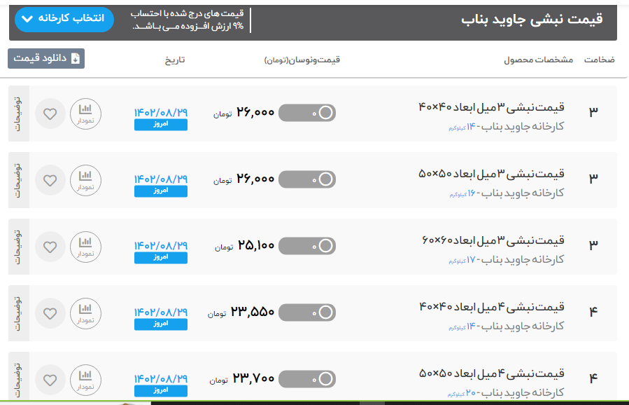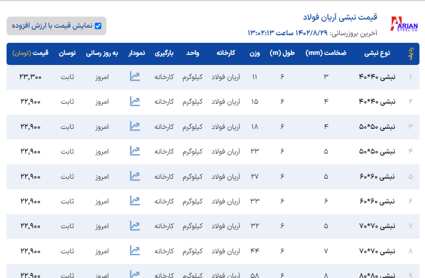 " فولاد جاوید بناب " با سلام و عرض ادب *قیمت روز دوشنبه ۱۴۰۲/۰۸/۲۹ 🔹نبشی 40*3 سبک : ۲۶۰۰۰۰ ریال 🔹نبشی 40*3 : ۲۳۵۰۰۰ ریال 🔹نبشی 40*4 سبک : ۲۳۵۵۰۰ ریال 🔹نبشی 40*4 : ۲۳۳۰۰۰ ریال 🔹نبشی 50*3 سبک : ۲۶۰۰۰۰ ریال 🔹نبشی 50*3 : ۲۳۵۰۰۰ ریال 🔹نبشی 50*4 سبک : ۲۳۷۰۰۰ ریال 🔹نبشی 50*4 : ۲۳۵۰۰۰ ریال 🔹نبشی 50*5 سبک : ۲۳۳۵۰۰ ریال 🔹نبشی 50*5 : ۲۳۲۰۰۰ ریال 🔹نبشی 60*3 : ۲۵۱۰۰۰ ریال 🔹نبشی 60*4 : ۲۴۲۰۰۰ ریال 🔹نبشی 60*5 : ۲۳۳۰۰۰ ریال 041-37780433-6 t.me/javidsteel_bonab www.javidsteel.co Telegram فولاد جاوید بناب فولاد جاوید بناب تولیدکننده انواع نبشی ومقاطع فولادی