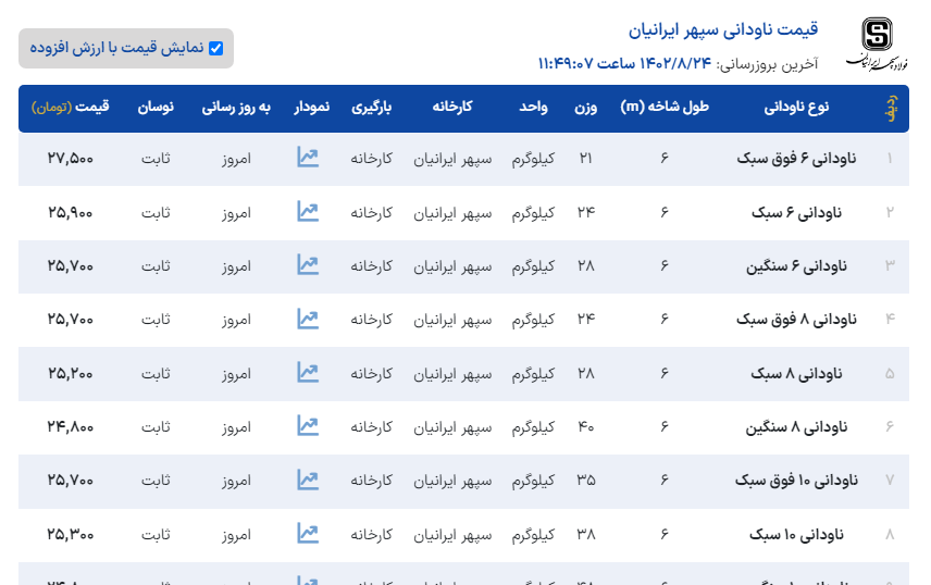 #قیمت #ناودانی #ناب_تبریز #کارخانه 🌎 چهارشنبه 24 آبان ماه 1402 🌎 طول:6متر ناودانی 8 ⏪ 238000 ریال ناودانی 10 ⏪ 238000 ریال ناودانی 12 ⏪ 238000 ریال ناودانی 14 ⏪ 245000 ریال ناودانی 16 ⏪ 245000 ریال ✅تهران آهن خریدی امن,آسان,ارزان ✅کارشناس فروش : آقای قاجار 🔴 مشاهده قیمت ناودانی 🔴 (https://tehran-ahan.com/)⚙️برای مشاهده کامل جدول قیمت ناودانی می توانید به سایت تهران آهن مراجعه کنید: ✅(50 خط ویژه): ☎️021-86073000 📱 instagram.com/tehran.ahan 🌏 https://b2n.ir/r38781 🔗 t.me/Tehran_ahan
