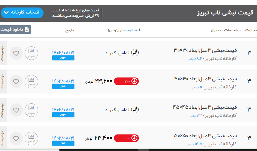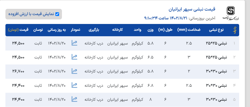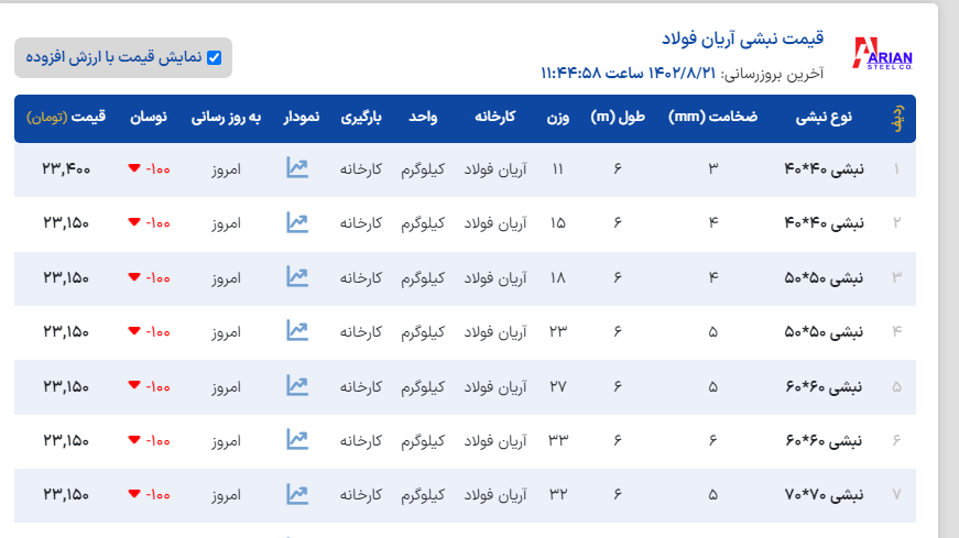 اعلام موجودی نبشی آهن یاب لیست کالای نبشی نورد آریان فولاد: 📅 یکشنبه : ۱۴۰۲/۸/۲۱ (کاهش قیمت) ♦️ نبشی ۵*۵ 💵23250 تومان 📉 100 ♦️ نبشی ۶*۶ 💵 23250 تومان 📉 100 ♦️ نبشی ۷*۷ 💵 23250 تومان 📉 100 ♦️نبشی ۸*۸ 💵 23250 تومان 📉 100 ♦️نبشی ۱۰*۱۰ 💵23400 تومان 📉 100 ♦️نبشی ۱۲*۱۲ 💵23400 تومان 📉 100