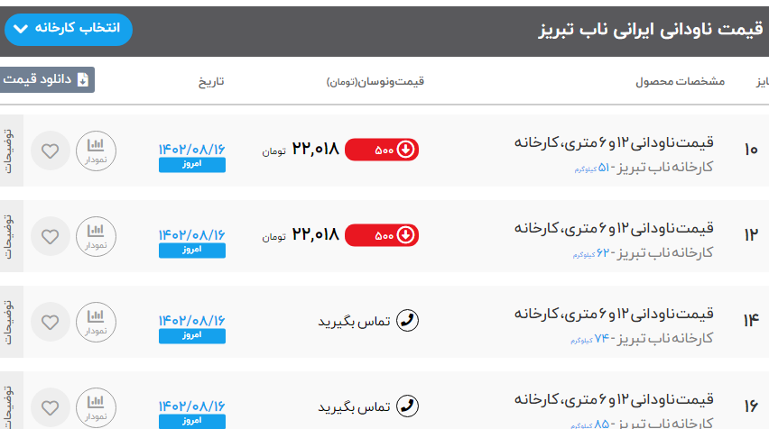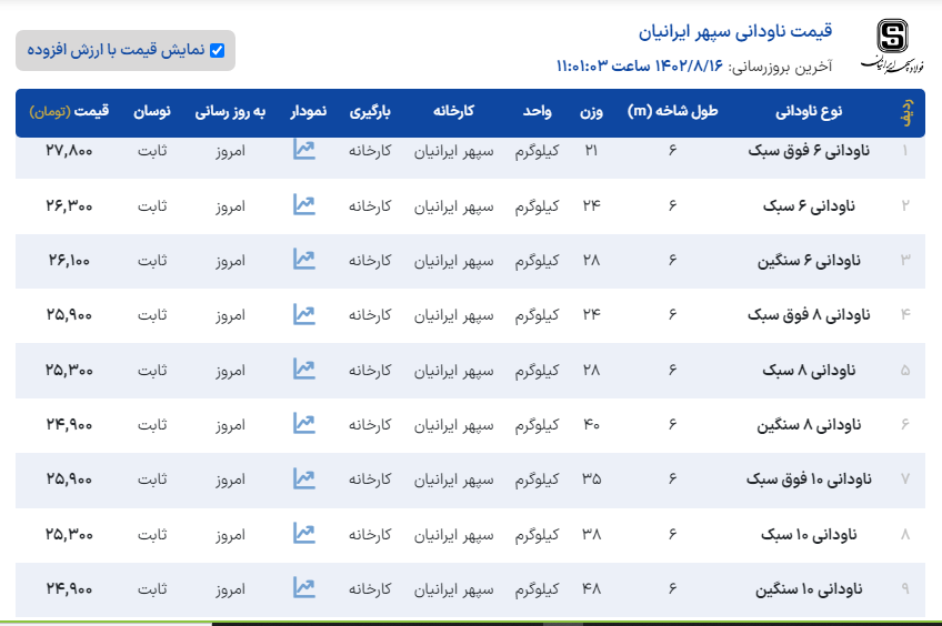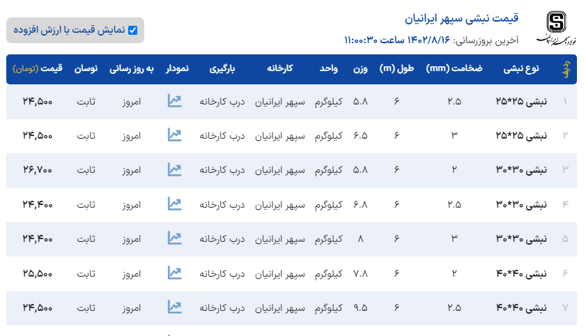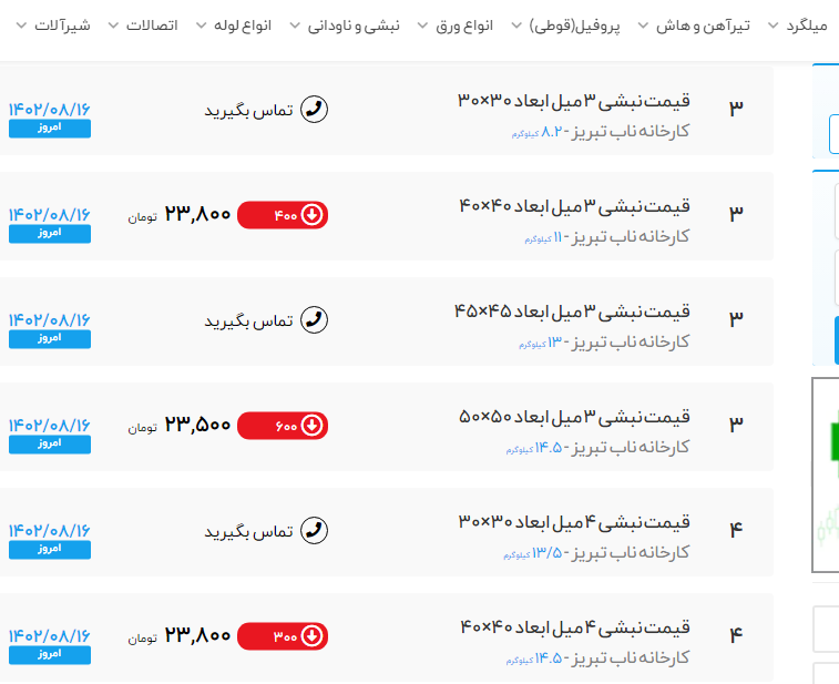#قیمت #نبشی #سپهر_ایرانیان #کارخانه 🌎 سه شنبه 16 آبان ماه 1402 🌎 طول:6متر نبشی30*30 ضخامت 3 ⏪ 244000 ریال نبشی40*40 ضخامت 3 ⏪ 245000 ریال نبشی40*40 ضخامت 4 ⏪ 246000 ریال نبشی50*50 ضخامت 3 ⏪ 248000 ریال نبشی50*50 ضخامت 4 ⏪ 246000 ریال نبشی50*50 ضخامت 5 ⏪ 246000 ریال نبشی60*60 ضخامت 4 ⏪ 255000 ریال نبشی60*60 ضخامت 5 ⏪ 248000 ریال نبشی60*60 ضخامت 6 ⏪ 248000 ریال نبشی80*80 ضخامت 8 ⏪ 243000 ریال نبشی100*100 ضخامت 10 ⏪ 243000 ریال نبشی120*120 ضخامت 12 ⏪ 250000 ریال ✅تهران آهن خریدی امن,آسان,ارزان ✅کارشناس فروش : آقای قاجار 🔴 مشاهده (https://tehran-ahan.com/) قیمت نبشی (https://tehran-ahan.com/product-category/angel/?utm_source=telegram&utm_medium=social&utm_campaign=angel) 🔴 (https://tehran-ahan.com/)⚙️برای مشاهده کامل جدول قیمت نبشی می توانید به سایت تهران آهن مراجعه کنید: ✅(50 خط ویژه): ☎️021-86073000 📱 instagram.com/tehran.ahan 🌏 https://b2n.ir/z24424 🔗 t.me/Tehran_ahan