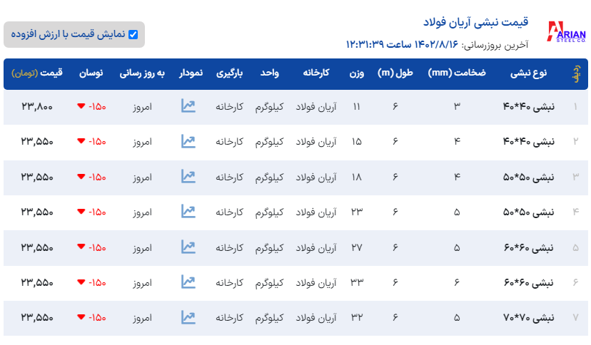 #قیمت #نبشی #آریان_فولاد #کارخانه 🌎 سه شنبه 16 آبان ماه 1402 🌎 طول:6متر نبشی40*40 ضخامت 3 ⏪ 243000 ریال نبشی40*40 ضخامت 4 ⏪ 235500 ریال نبشی50*50 ضخامت 4 ⏪ 235500 ریال نبشی50*50 ضخامت 5 ⏪ 235500 ریال نبشی60*60 ضخامت 6 ⏪ 235500 ریال نبشی70*70 ضخامت 5 ⏪ 235500 ریال نبشی70*70 ضخامت 7 ⏪ 235500 ریال نبشی80*80 ضخامت 8 ⏪ 235500 ریال نبشی10*10 ضخامت 10 ⏪ 237000 ریال نبشی 12*12 ضخامت 12 ⏪ 237000 ریال ✅تهران آهن خریدی امن,آسان,ارزان ✅کارشناس فروش : آقای قاجار 🔴 (https://tehran-ahan.com/) مشاهده قیمت نبشی (https://tehran-ahan.com/product-category/angel/?utm_source=telegram&utm_medium=social&utm_campaign=angel) 🔴 (https://tehran-ahan.com/)⚙️برای مشاهده کامل جدول قیمت نبشی می توانید به سایت تهران آهن مراجعه کنید: ✅(50 خط ویژه): ☎️021-86073000 📱 instagram.com/tehran.ahan 🌏 https://b2n.ir/z24424 🔗 t.me/Tehran_ahan
