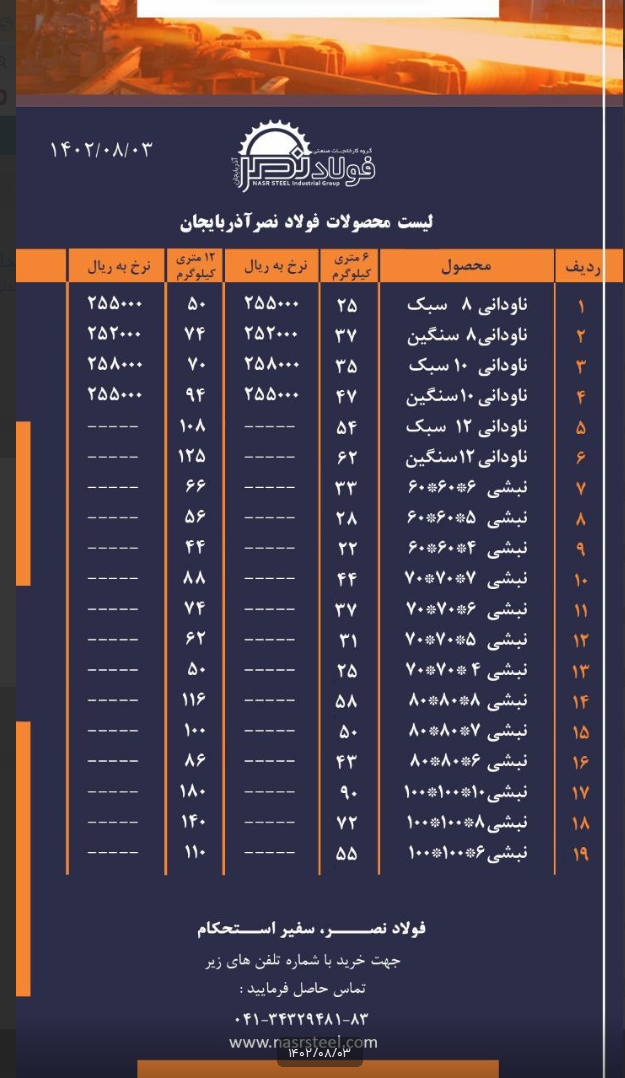💠 گروه کارخانجات #فولاد_نصر_آذربایجان 📌تولید کننده انواع ناودانی ، نبشی و تیرآهن با استاندارد های روز دنیا 📌صادر کننده نمونه استانی #جهت_مشاهده_پروفایل_فولاد_نصر_آذربایجان👇🏻 📌https://foolad24.com/profile/12247 #جهت_مشاهده_اعلام_موجودی_فولاد_نصر_آذربایجان https://foolad24.com/profile/12247/inventory 📍آدرس کارخانه : تبریز ، جاده آذرشهر ، شهرک صنعتی سلیمی 📌تلفن های دپارتمان فروش: ☎️04134329481 ☎️04134329482 ☎️04134329483 📱09129308689 📱09144199362 🆔https://t.me/NasrsteelAZ 📌https://www.instagram.com/nasrsteel 🌐nasrsteel.com