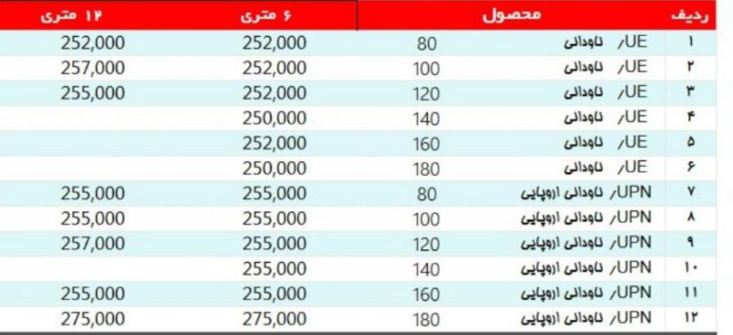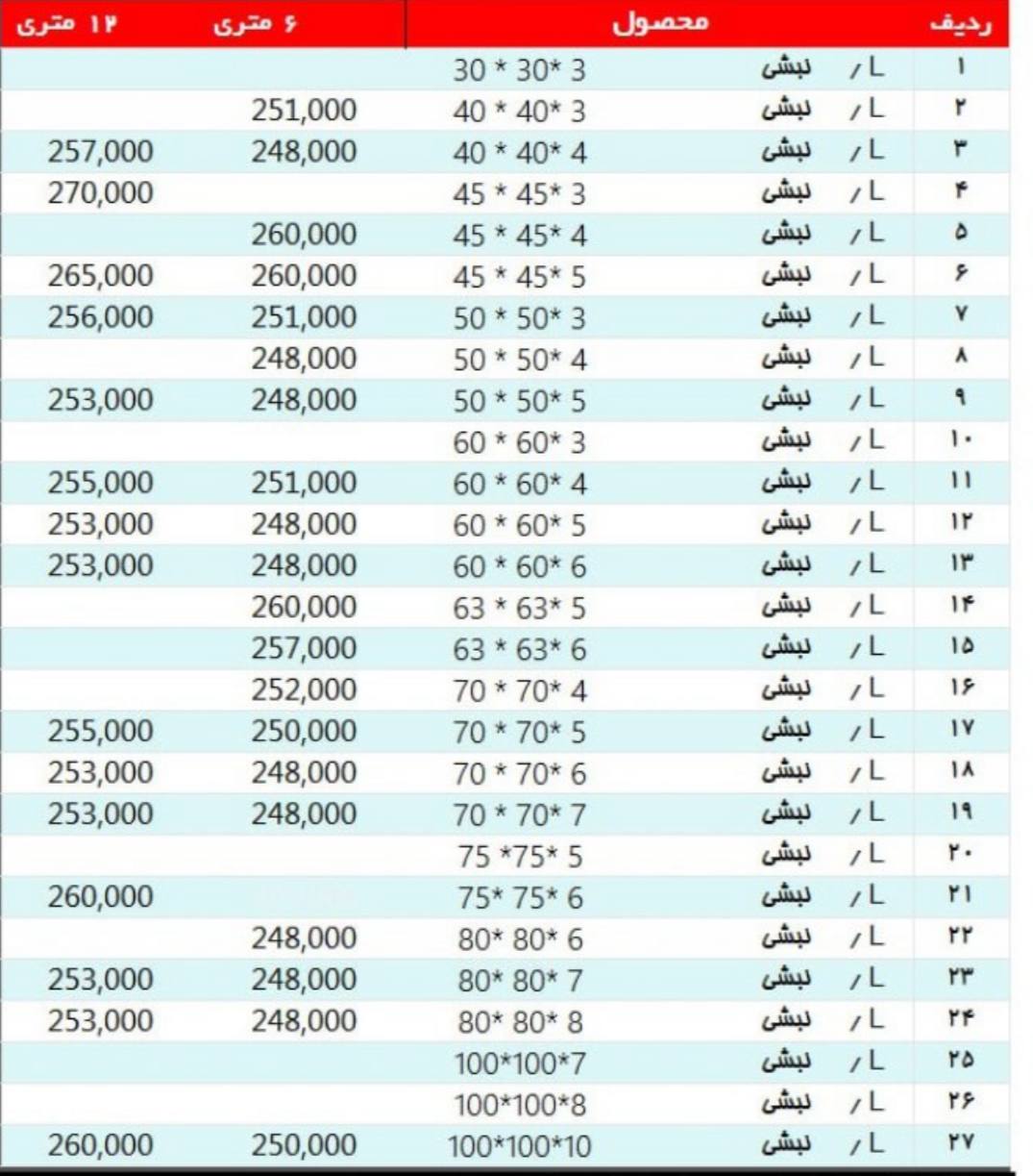 🔸نبشی 40*3 سبک : ۲۷۳۰۰۰ ریال 🔸نبشی 40*3 : ۲۵۹۰۰۰ ریال 🔸نبشی 40*4 سبک : ۲۵۶۵۰۰ ریال 🔸نبشی 40*4 : ۲۵۶۰۰۰ ریال 🔸نبشی 50*3 سبک : ۲۷۳۰۰۰ ریال 🔸نبشی 50*3 : ۲۵۹۰۰۰ ریال 🔸نبشی 50*4 سبک : ۲۵۷۵۰۰ ریال 🔸نبشی 50*4 : ۲۵۷۰۰۰ ریال 🔸نبشی 50*5 سبک : ۲۵۶۵۰۰ ریال 🔸نبشی 50*5 : ۲۵۶۰۰۰ ریال 🔸نبشی 60*3 : ۲۶۹۰۰۰ ریال 🔸نبشی 60*4 : ۲۶۰۰۰۰ ریال 🔸نبشی 60*5 : ۲۵۷۰۰۰ ریال
