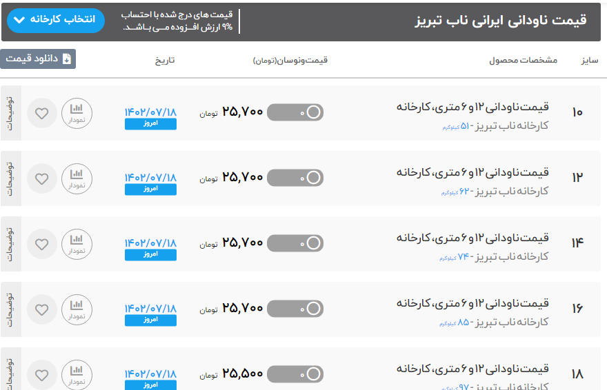 ناودانی 6 وزن 30 کیلوگرم ⬅️ 27100 تومان ناودانی 6 وزن 60 کیلوگرم ⬅️ 26500 تومان ناودانی 6/5 وزن 35 کیلو ⬅️ 27100 تومان ناودانی 8 وزن 40 کیلوگرم ⬅️ 26000 تومان ناودانی 8 وزن 80 کیلوگرم ⬅️ 26100 تومان ناودانی10وزن 50 کیلوگرم ⬅️ 26000 تومان ناودانی 10 وزن 100 کیلو ⬅️ 26100 تومان