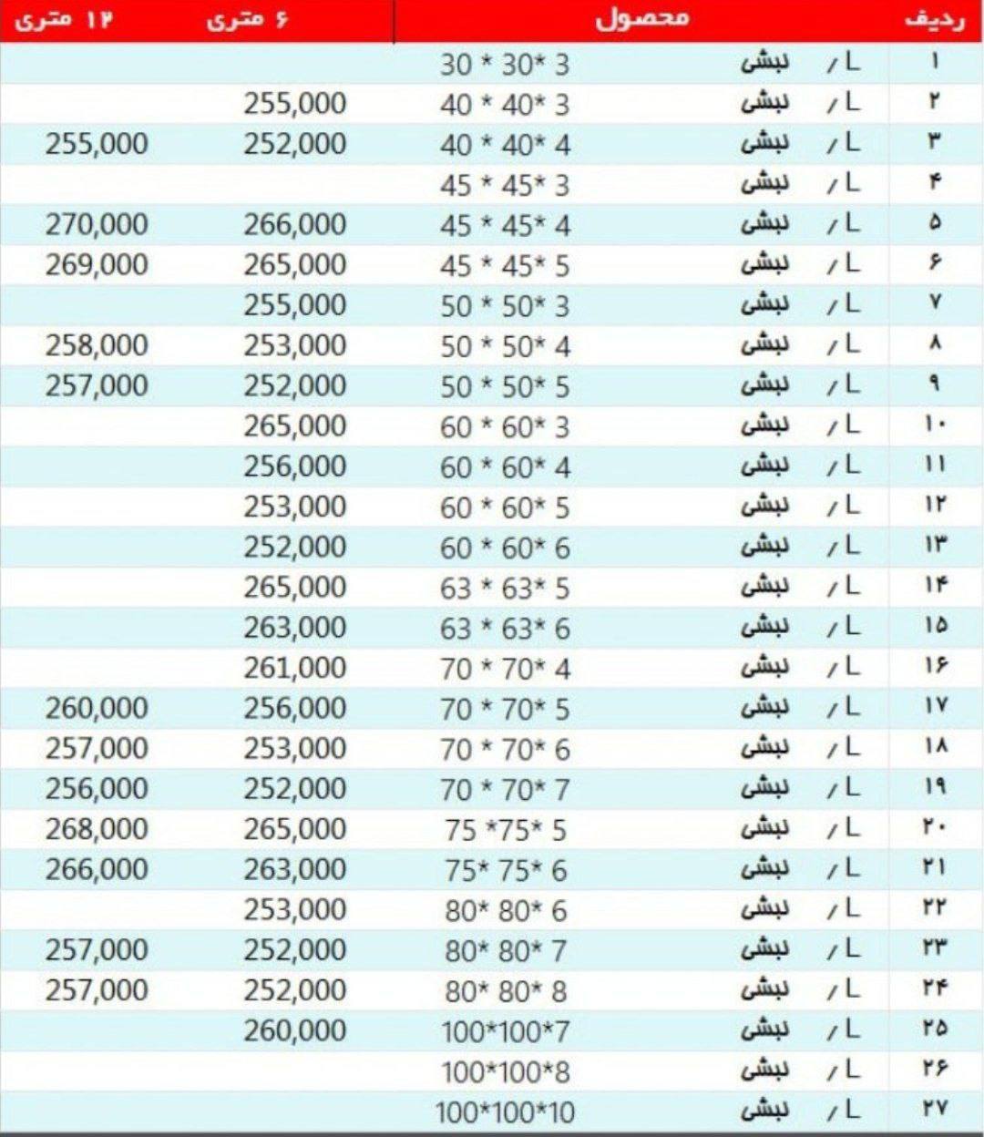 آرمان گستر اقتدار (آهن آرمان) 👈ضمانت یک خرید مطمئن👉 #قیمت روز انواع #نبشی #نبشی_استاندارد 🗓 چهارشنبه، 05 مهر 1402 🗓 . 📢 قیمت روز نبشی استاندارد، 6 متری 📢 🔸 نبشی سایز 2x2x2 (شاخه 4.5کیلویی): 520.000 ريال 🔸 نبشی سایز 2x2x3 (شاخه 5.5کیلویی): ء call 🔸 نبشی سایز 2.5x2.5x2 (شاخه 5.5کیلویی): ء call 🔸 نبشی سایز 2.5x2.5x3 (شاخه 7کیلویی): 265.000 ریال 🔸 نبشی سایز 3x3x2 (شاخه 7کیلویی): 260.000 ريال 🔸 نبشی سایز 3x3x3 (شاخه 9کیلویی): 262.000 ریال 🔸 نبشی سایز 4x4x2 (شاخه 10کیلویی): 265.000 ریال 🔸 نبشی سایز 4x4x3 (شاخه 12کیلویی): 257.000 ریال 🔸 نبشی سایز 4x4x4 (شاخه 15کیلویی): 257.000 ریال 🔸 نبشی سایز 5x5x3 (شاخه 16کیلویی): 259.000 ریال 🔸 نبشی سایز 5x5x4 (شاخه 19کیلویی): 259.000 ریال 🔸 نبشی سایز 5x5x5 (شاخه 23کیلویی): 259.000 ریال 🔸 نبشی سایز 6x6x4 (شاخه 24کیلویی): 267.000 ریال 🔸 نبشی سایز 6x6x5 (شاخه 28کیلویی): 259.000 ریال 🔸 نبشی سایز 6x6x6 (شاخه 33کیلویی): 259.000 ریال 🔸 نبشی سایز 7x7x4 (شاخه 29کیلویی): ء call 🔸 نبشی سایز 7x7x5 (شاخه 33کیلویی): ء call 🔸 نبشی سایز 7x7x6 (شاخه 37کیلویی): 265.000 ریال 🔸 نبشی سایز 7x7x7 (شاخه 42کیلویی): 262.000 ریال 🔸 نبشی سایز 8x8x6 (شاخه 49کیلویی): ء call 🔸 نبشی سایز 8x8x8 (شاخه 58کیلویی): 255.000 ریال 🔸 نبشی سایز 10x10x8 (شاخه 74کیلویی): 290.000 ريال 🔸 نبشی سایز 10x10x10 (شاخه 88کیلویی): 255.000 ریال 🔸 نبشی سایز 12x12x12 (شاخه 124کیلویی): 262.000 ریال ~~~~~~~~~~~~~~~~~~ 📢 قیمت روز نبشی استاندارد، 12 متری 📢 🔸 نبشی سایز 7x7x6 (شاخه 74کیلویی): ء call 🔸 نبشی سایز 7x7x7 (شاخه 84کیلویی): ء call 🔸 نبشی سایز 8x8x6 (شاخه 90کیلویی): ء call 🔸 نبشی سایز 8x8x7 (شاخه 98کیلویی): 285.000 ریال 🔸 نبشی سایز 8x8x8 (شاخه 116کیلویی): 270.000 ریال 🔸 نبشی سایز 9x9x7 (شاخه 113کیلویی): 350.000 ریال 🔸 نبشی سایز 9x9x8 (شاخه 129کیلویی): 350.000 ریال 🔸 نبشی سایز 9x9x9 (شاخه 142کیلویی): 350.000 ريال 🔸 نبشی سایز 10x10x7 (شاخه 130کیلویی): 325.000 ریال 🔸 نبشی سایز 10x10x8 (شاخه 156کیلویی): 325.000 ریال 🔸 نبشی سایز 10x10x10 (شاخه 176کیلویی): 280.000 ریال 🔸 نبشی سایز 12x12x10 (شاخه 212کیلویی): 400.000 ریال 🔸 نبشی سایز 12x12x12 (شاخه 248کیلویی): 295.000 ریال 🔸 نبشی سایز 14x14x12 (شاخه 299کیلویی): 420.000 ریال 🔸 نبشی سایز 14x14x14 (شاخه 350کیلویی): 420.000 ریال 🔸 نبشی سایز 15x15x12 (شاخه 324کیلویی): 440.000 ریال 🔸 نبشی سایز 15x15x15 (شاخه 400کیلویی): 450.000 ریال 🔸 نبشی سایز 16x16x14 (شاخه 400کیلویی): 450.000 ریال 🔸 نبشی سایز 16x16x16 (شاخه 450کیلویی): 550.000 ریال 🔸 نبشی سایز 18x18x18 (شاخه 570کیلویی): ء call 🔸 نبشی سایز 20x20x20 (شاخه 700کیلویی): 550.000 ریال ~~~~~~~~~~~~~~~~~~ ☎️۰۲۱-۵۸۳۳۶ داخلی 115 خانم گل پرور 🌐www.ahanarman.com وب سایت @AhanArmanPrice🆔 کانال قیمت روز تلگرام