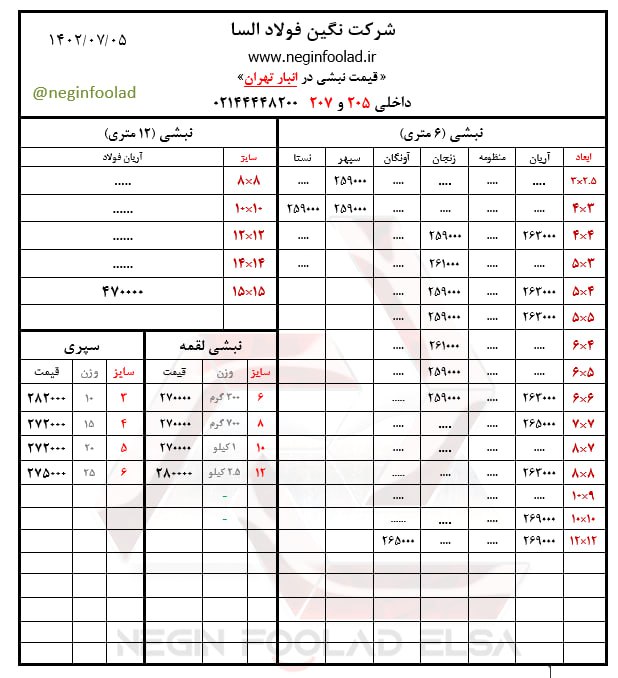 ﷽ ۰۵ / مهــر / ۱۴۰۲ 🗓 ▪️استعلام قیمت با تماس تلفنی▪️ 🔵موجودی نبشی انبار تهران 🔹نبشی ۳ اسپیرال اصفهان ( ۸ ك) 🔹نبشی ۳ شکفته سنگین ( ۸ ك) 🔹نبشی ۳ آی هان تهران ( ۷ ك) 🔹نبشی ۳ سپهر ( ۷ ك) .................................................. 🔹نبشی ۴ اسپیرال اصفهان ( ۱۴ ك) 🔹نبشی ۴ شکفته ( ۱۰/۵ ك) 🔹نبشی ۴ فولاد پارسه ( ۹ ك) 🔹نبشی ۴ فولاد سپهر ( ۱۰ ك) 🔹نبشی ۴ ابهر ( ۱۴ ك) 🔹نبشی ۴ سپهر سنگین ( ۱۴ ك) .................................................. 🔹نبشی ۵ گ۳ سپهر ( ۱۵ ك) 🔹نبشی ۵ گ۵ زنجان ( ۲۲ ك) 🔹نبشی ۵ ناب تبریز ( ۲۲ ك) 🔹نبشی ۵ گ ۴ ناب تبریز ( ۱۸ ك) 🔹نبشی ۵ گ۴ زنجان ( ۱۸ ك) .................................................. 🔹نبشی ۶ زنجان ( ۳۱ ك) 🔹نبشی ۶ گ۴ زنجان ( ۲۳ ك) 🔹نبشی ۶ گ۵ زنجان ( ۲۷ ك) 🔹نبشی ۶ ناب تبریز ( ۳۲ ك) .................................................. 🔹نبشی ۷ آریان فولاد ( ۴۴ ك) 🔹نبشی ۷ ناب تبریز ( ۴۲ ك) .................................................. 🔹نبشی ۸ آریان فولاد ( ۵۶ ك) 🔹نبشی ۸ فولاد اشتهارد ( ۵۶ ك) 🔹نبشی ۸ گ۷ شکفته ( ۵۰ ك) .................................................. 🔹نبشی ۱۰ شکفته ( ۸۰ ك) 🔹نبشی ۱۰ آریان فولاد ( ۸۸ ك) 🔹نبشی۱۰ اشتهارد ( ۸۶ ك) 🔹نبشی۱۰ گ۸ اشتهارد ( ۷۵ ك) .................................................. 🔹نبشی ۱۲ آریان فولاد ( ۱۳۳ ك) 🔹نبشی ۱۲ مگا استیل ( ۱۲۹ ك) .................................................. 🔹نبشی ۹ آریان فولاد (بلند) 🔹نبشی ۱۴ آریان فولاد (بلند) 🔹نبشی ۱۵ آریان فولاد (بلند) 🔹نبشی ۲۰ آریان فولاد (بلند) .................................................. موجودی سپری انبار تهران 🔹سپری ۳ نورد آسمان ( ۱۰ ك) 🔹سپری ۴ نوردآسمان ( ۱۵ ك) 🔹سپری ۴ شکفته ( ۱۵ ك) 🔹سپری ۵ نورد آسمان ( ۲۰ ك ) 🔹سپری ۵ شکفته ( ۲۱ ك) 🔹سپری ۶ نورد آسمان ( ۲۶ ك) 🔹سپری ۶ شکفته ( ۲۵ ك)