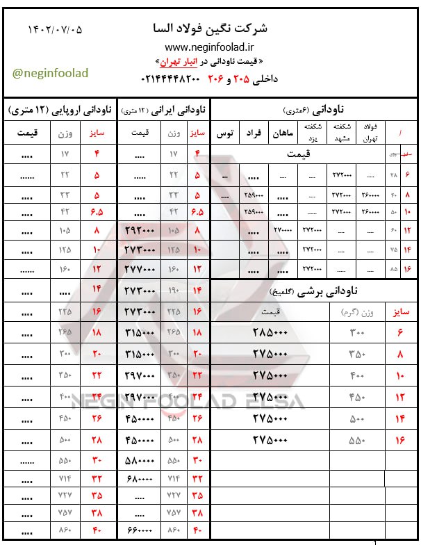 ((بسم الله الرحمن الرحیم)) ✅ #شرکت_آسیا_فولاد_امین 🔵لیست نبشی و ناودانی🔵 ((انبار تهران)) 🔴1402/07/05🔴 #نبشی_سپهر 🔶نشی ۳ گوشت ۲/۵ سپهر:📞 #نبشی_آیهان 🔶نشی ۳ گوشت ۲/۵ آیهان:📞 #نبشي_اشتهارد 🔶نبشي ٤ گوشت ۳ اشتهارد:📞 🔶نبشی ۱۰ گوشت ۱۰ اشتهارد: 📞 #نبشی_پارسه 🔶نبشی ۴ گوشت ۳ پارسه : 📞 🔶نبشی ۴ گوشت ۴ پارسه : 📞 #نبشی_ظهوریان 🔶نبشی ۳ گوشت۳ ظهوریان:📞 🔶نبشی ۴ گوشت ۳ ظهوریان:📞 🔶نبشی ۵ گوشت ۳ ظهوریان:📞 🔶نبشي ٨ گوشت ۷ ظهوریان: 📞 #نبشی_شکفته 🔶نبشی ۳ گوشت ۳ شکفته:📞 🔶نبشی ۲/۵ شکفته:📞 #نبشی_آریان_فولاد 🔶نبشی ۴ گوشت ۳ آریان فولاد:📞 🔶نبشی ۴ گوشت ۴ آریان فولاد:📞 🔶نبشی۵ گوشت ۴ آریان فولاد:📞 🔶نبشی ۵ گوشت ۵ آریان فولاد:📞 🔶نبشی ۶ گوشت ۵ آریان فولاد:📞 🔶نبشی ۶ گوشت ۶ آریان فولاد:📞 🔶نبشی ۷ گوشت ۷ آریان فولاد:📞 🔶نبشی ۸ گوشت ۸ آریان فولاد:📞 🔶نبشی ۱۰ گوشت ۱۰ آریان فولاد:📞 🔶نبشی ۱۲ گوشت ۱۲ آریان فولاد:📞 🔶نبشی ۱۵ گوشت ۱۵ آریان فولاد:📞 #نبشی_دهشير_يزد 🔶نبشی ۱۰ گوشت ۱۰ دهشیر یزد:📞 #نبشي_لقمه 🔶نبشی لقمه ۸ * ٨ :📞 🔶نبشي لقمه ١٠* ١٠ :📞 ➖➖➖➖➖➖➖➖➖➖➖➖ #ناودانی_شکفته 🔷ناودانی ۶ شکفته: 📞 🔷ناودانی۶/۵شکفته: 📞 🔷ناودانی ۸ شکفته: 📞 🔷ناودانی ۱۰ شکفته: 📞 🔷ناودانی ۱۲ شکفته: 📞 🔷ناودانی ۱۴ شکفته: 📞 🔷ناودانی ۱۶ شکفته: 📞 #ناوداني_دهشير_يزد 🔷ناوداني ۸ دهشير يزد: 📞 🔷ناوداني ١٠ دهشير يزد: 📞 🔷ناوداني ١٢ دهشير يزد: 📞 #ناوداني_لاهور 🔷ناوداني ٦ سبك لاهور :📞 #ناودانی_فولادتهران 🔷ناودانی ۸ فولاد تهران: 📞 🔷ناودانی ۸ سبک فولاد تهران: 📞 🔷ناودانی ۱۰ فوق سبک فولاد تهران: 📞 🔷ناودانی ۱۰ ابهر:📞 🔷ناوداني ٢٤ فايكو: 📞 ➖➖➖➖➖➖➖➖➖➖➖➖ #سپری ♦️سپری ۵ شکفته:📞