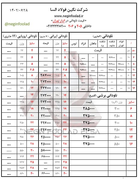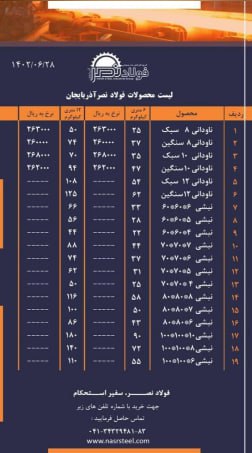 آرمان گستر اقتدار (آهن آرمان) 👈 ضمانت یک خرید مطمئن👉 #قیمت روز انواع #ناودانی #ناودانی_استاندارد #استاندارداروپا #استاندارد 🗓 سه شنبه، 28 شهریور 1402 🗓 . 📢قیمت روز ناودانی استاندارد (اروپا) انبار تهران📢 🏭 طول 6 متری🏭 🔸 سایز 4 بال 20B (شاخه 17 کیلویی): 400.000 ریال 🔸 سایز 5 بال 25B (شاخه 23 کیلویی): 310.000 ریال 🔸 سایز 5 بال 38B (شاخه 33 کیلویی): 560.000 ریال 🔸 سایز 6.5 بال 42B (شاخه 42 کیلویی): 560.000 ریال ~~~~~~~~~~~~~~~~~~ 📢قیمت روز ناودانی استاندارد (اروپا) انبار تهران📢 🏭 طول 12 متری🏭 🔸 سایز 6.5 بال 42B (شاخه 85 کیلویی): 560.000 ریال 🔸 سایز 8 بال 45B (شاخه 104 کیلویی): 282.000 ریال 🔸 سایز 10 بال 50B (شاخه 127 کیلویی): 270.000 ریال 🔸 سایز 12 بال 55B (شاخه 160 کیلویی): 270.000 ریال 🔸 سایز 14 بال 60B (شاخه 192 کیلویی): 267.000 ریال 🔸 سایز 16 بال 65B (شاخه 225 کیلویی): 267.000 ریال 🔸 سایز 18 بال 70B (شاخه 264 کیلویی): 298.000 ریال 🔸 سایز 20 بال 75B (شاخه 303 کیلویی): 305.000 ریال 🔸 سایز 22 بال 80B (شاخه 352 کیلویی): 290.000 ریال 🔸 سایز 24 بال 85B (شاخه 398 کیلویی): 285.000 ریال 🔸 سایز 26 بال 90B (شاخه 454 کیلویی): 425.000 ریال 🔸 سایز 28 بال 95B (شاخه 500 کیلویی): 425.000 ریال 🔸 سایز 30 بال 100B (شاخه 550 کیلویی): 560.000 ریال 🔸 سایز 32 بال 100B (شاخه 714 کیلویی): 650.000 ريال 🔸 سایز 35 بال 100B (شاخه 720 کیلویی): ء call 🔸 سایز 38 بال 102B (شاخه 757 کیلویی): ء call 🔸 سایز 40 بال 110B (شاخه 860 کیلویی): 640.000 ريال ~~~~~~~~~~~~~~~~~~ 📢قیمت روز ناودانی استاندارد (تولید داخل) انبار تهران📢 🏭 طول 6 متری🏭 🔸 سایز 5 (شاخه 22 کیلویی): 295.000 ریال 🔸 سایز 5 (شاخه 25کیلویی): ء call 🔸 سایز 6 (شاخه 24 کیلویی): 268.000 ریال 🔸 سایز 6 (شاخه 28 کیلویی): 268.000 ریال 🔸 سایز 8 (شاخه 32 کیلویی): 260.000 ریال 🔸 سایز 8 (شاخه 40 کیلویی): 260.000 ریال 🔸 سایز 10 (شاخه 39 کیلویی): 260.000 ریال 🔸 سایز 10 (شاخه 50 کیلویی): 265.000 ریال 🔸 سایز 12 (شاخه 53 کیلویی): call 🔸 سایز 12 (شاخه 61 کیلویی): 270.000 ریال 🔸 سایز 14 (شاخه 66 کیلویی): 270.000 ریال 🔸 سایز 14 (شاخه 73 کیلویی): 270.000 ریال 🔸 سایز 16 (شاخه 81 کیلویی): 270.000 ریال ~~~~~~~~~~~~~~~~~~ 📢قیمت روز ناودانی استاندارد (تولید داخل) انبار تهران📢 🏭 طول 12 متری🏭 🔸 سایز 8 (شاخه 65 کیلویی): 268.000 ریال 🔸 سایز 8 (شاخه 80 کیلویی): 268.000 ریال 🔸 سایز 10 (شاخه 80 کیلویی): 262.000 ریال 🔸 سایز 10 (شاخه 100 کیلویی): 262.000 ریال 🔸 سایز 12 (شاخه 104 کیلویی): 275.000 ریال 🔸 سایز 12 (شاخه 122 کیلویی): 275.000 ریال 🔸 سایز 14 (شاخه 134 کیلویی): 275.000 ریال 🔸 سایز 14 (شاخه 146 کیلویی): 275.000 ریال 🔸 سایز 16 (شاخه 162 کیلویی): 275.000 ریال 🔸 سایز 18 (شاخه 192 کیلویی): 260.000 ریال 🔸 سایز 20 (شاخه 230 کیلویی): 370.000 ریال ~~~~~~~~~~~~~~~~~~ ☎️۰۲۱-۵۸۳۳۶ داخلی 115 خانم گل پرور 🌐www.ahanarman.com وب سایت @AhanArmanPrice🆔 کانال قیمت روز تلگرام