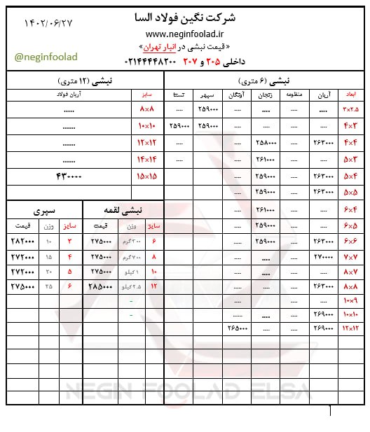 آرمان گستر اقتدار (آهن آرمان) 👈ضمانت یک خرید مطمئن👉 #قیمت روز انواع #نبشی #نبشی_استاندارد 🗓 یکشنبه، 26 شهریور 1402 🗓 . 📢 قیمت روز نبشی استاندارد، 6 متری 📢 🔸 نبشی سایز 2x2x2 (شاخه 4.5کیلویی): 520.000 ريال 🔸 نبشی سایز 2x2x3 (شاخه 5.5کیلویی): ء call 🔸 نبشی سایز 2.5x2.5x2 (شاخه 5.5کیلویی): ء call 🔸 نبشی سایز 2.5x2.5x3 (شاخه 7کیلویی): 270.000 ریال 🔸 نبشی سایز 3x3x2 (شاخه 7کیلویی): 260.000 ريال 🔸 نبشی سایز 3x3x3 (شاخه 9کیلویی): 264.000 ریال 🔸 نبشی سایز 4x4x2 (شاخه 10کیلویی): 270.000 ریال 🔸 نبشی سایز 4x4x3 (شاخه 12کیلویی): 260.000 ریال 🔸 نبشی سایز 4x4x4 (شاخه 15کیلویی): 260.000 ریال 🔸 نبشی سایز 5x5x3 (شاخه 16کیلویی): 260.000 ریال 🔸 نبشی سایز 5x5x4 (شاخه 19کیلویی): 260.000 ریال 🔸 نبشی سایز 5x5x5 (شاخه 23کیلویی): 260.000 ریال 🔸 نبشی سایز 6x6x4 (شاخه 24کیلویی): 272.000 ریال 🔸 نبشی سایز 6x6x5 (شاخه 28کیلویی): 260.000 ریال 🔸 نبشی سایز 6x6x6 (شاخه 33کیلویی): 260.000 ریال 🔸 نبشی سایز 7x7x4 (شاخه 29کیلویی): ء call 🔸 نبشی سایز 7x7x5 (شاخه 33کیلویی): ء call 🔸 نبشی سایز 7x7x6 (شاخه 37کیلویی): 272.000 ریال 🔸 نبشی سایز 7x7x7 (شاخه 42کیلویی): 264.000 ریال 🔸 نبشی سایز 8x8x6 (شاخه 49کیلویی): ء call 🔸 نبشی سایز 8x8x8 (شاخه 58کیلویی): 255.000 ریال 🔸 نبشی سایز 10x10x8 (شاخه 74کیلویی): 292.000 ريال 🔸 نبشی سایز 10x10x10 (شاخه 88کیلویی): 255.000 ریال 🔸 نبشی سایز 12x12x12 (شاخه 124کیلویی): 265.000 ریال ~~~~~~~~~~~~~~~~~~ 📢 قیمت روز نبشی استاندارد، 12 متری 📢 🔸 نبشی سایز 7x7x6 (شاخه 74کیلویی): ء call 🔸 نبشی سایز 7x7x7 (شاخه 84کیلویی): ء call 🔸 نبشی سایز 8x8x6 (شاخه 90کیلویی): ء call 🔸 نبشی سایز 8x8x7 (شاخه 98کیلویی): 292.000 ریال 🔸 نبشی سایز 8x8x8 (شاخه 116کیلویی): 277.000 ریال 🔸 نبشی سایز 9x9x7 (شاخه 113کیلویی): 362.000 ریال 🔸 نبشی سایز 9x9x8 (شاخه 129کیلویی): 362.000 ریال 🔸 نبشی سایز 9x9x9 (شاخه 142کیلویی): 362.000 ريال 🔸 نبشی سایز 10x10x7 (شاخه 130کیلویی): 332.000 ریال 🔸 نبشی سایز 10x10x8 (شاخه 156کیلویی): 332.000 ریال 🔸 نبشی سایز 10x10x10 (شاخه 176کیلویی): 280.000 ریال 🔸 نبشی سایز 12x12x10 (شاخه 212کیلویی): 402.000 ریال 🔸 نبشی سایز 12x12x12 (شاخه 248کیلویی): 332.000 ریال 🔸 نبشی سایز 14x14x12 (شاخه 299کیلویی): 422.000 ریال 🔸 نبشی سایز 14x14x14 (شاخه 350کیلویی): 422.000 ریال 🔸 نبشی سایز 15x15x12 (شاخه 324کیلویی): 442.000 ریال 🔸 نبشی سایز 15x15x15 (شاخه 400کیلویی): 402.000 ریال 🔸 نبشی سایز 16x16x14 (شاخه 400کیلویی): 452.000 ریال 🔸 نبشی سایز 16x16x16 (شاخه 450کیلویی): 552.000 ریال 🔸 نبشی سایز 18x18x18 (شاخه 570کیلویی): ء call 🔸 نبشی سایز 20x20x20 (شاخه 700کیلویی): 552.000 ریال ~~~~~~~~~~~~~~~~~~ ☎️۰۲۱-۵۸۳۳۶ داخلی 115 خانم گل پرور 🌐www.ahanarman.com وب سایت @AhanArmanPrice🆔 کانال قیمت روز تلگرام
