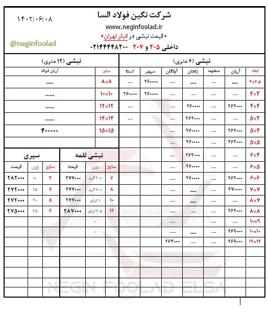 آرمان گستر اقتدار (آهن آرمان) 👈ضمانت یک خرید مطمئن👉 #قیمت روز انواع #نبشی #نبشی_استاندارد 🗓 شنبه، 11 شهریور 1402 🗓 . 📢 قیمت روز نبشی استاندارد، 12 متری 📢 🔸 نبشی سایز 7x7x6 (شاخه 74کیلویی): ء call 🔸 نبشی سایز 7x7x7 (شاخه 84کیلویی): ء call 🔸 نبشی سایز 8x8x6 (شاخه 90کیلویی): ء call 🔸 نبشی سایز 8x8x7 (شاخه 98کیلویی): 290.000 ریال 🔸 نبشی سایز 8x8x8 (شاخه 116کیلویی): 275.000 ریال 🔸 نبشی سایز 9x9x7 (شاخه 113کیلویی): 360.000 ریال 🔸 نبشی سایز 9x9x8 (شاخه 129کیلویی): 360.000 ریال 🔸 نبشی سایز 9x9x9 (شاخه 142کیلویی): 360.000 ريال 🔸 نبشی سایز 10x10x7 (شاخه 130کیلویی): 330.000 ریال 🔸 نبشی سایز 10x10x8 (شاخه 156کیلویی): 329.000 ریال 🔸 نبشی سایز 10x10x10 (شاخه 176کیلویی): 275.000 ریال 🔸 نبشی سایز 12x12x10 (شاخه 212کیلویی): 400.000 ریال . ☎️۰۲۱-۵۸۳۳۶ داخلی 115 خانم گل پرور 🌐www.ahanarman.com وب سایت @AhanArmanPrice🆔 کانال قیمت روز تلگرام