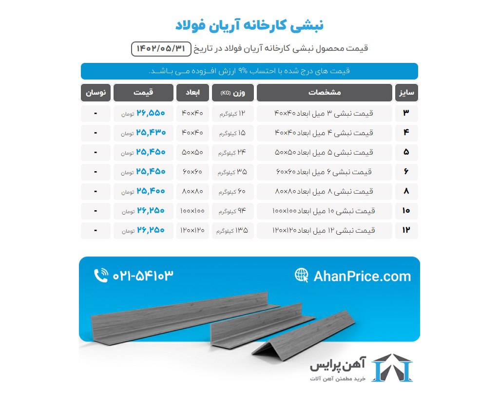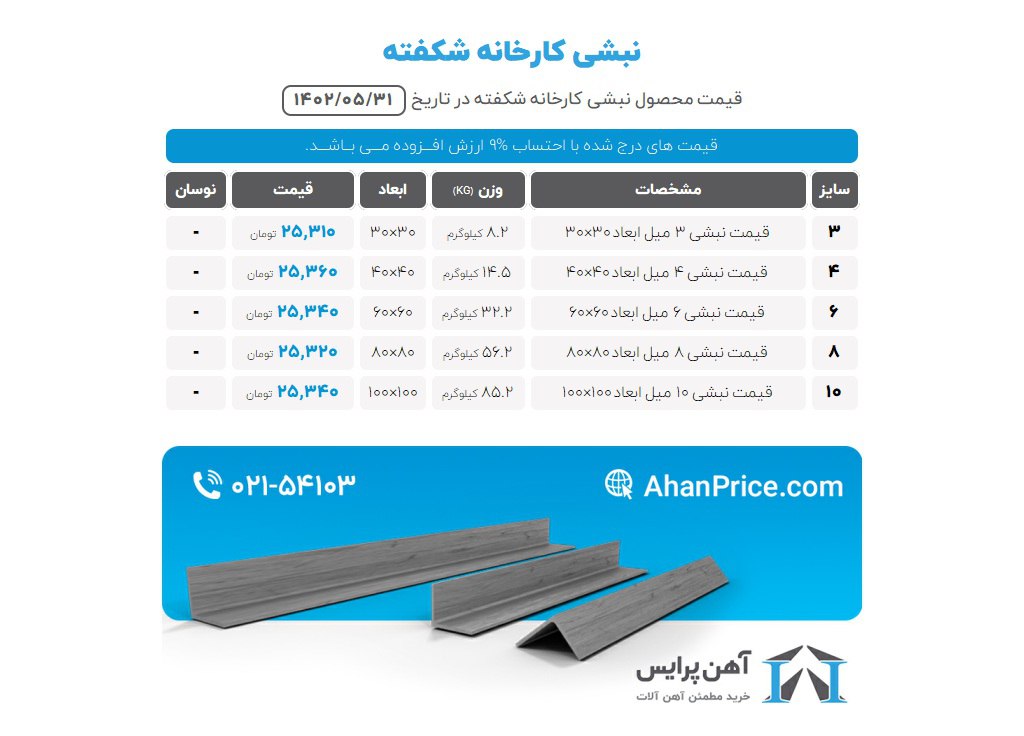 🔸نبشی ۳*۴: ۲۵۷۰۰۰﷼ 🔸نبشی ۴*۴: ۲۵۴۰۰۰﷼ 🔸نبشی ۳*۵: ۲۵۵۰۰۰﷼ 🔸نبشی۴*۵: ۲۵۱۰۰۰﷼ 🔸نبشی۵*۵ :۲۵۱۰۰۰﷼
