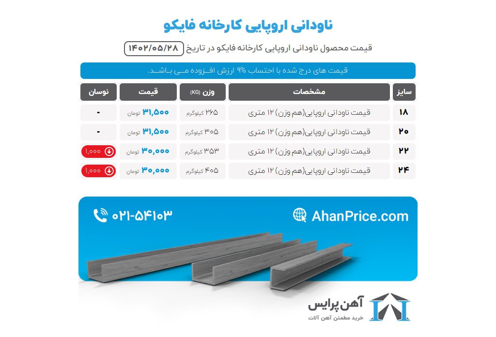🔷موجودی ناودانی انبار تهران🔷🔹ناودانی ۴ فابریک اروپایی ( ۱۷ ك) .................................................. 🔹ناودانی ۵ اسپیرال ( ۲۳ ك) .................................................. 🔹ناودانی ۶ اسپیرال ( ۳۰ ك) 🔹ناودانی ۶ شکفته سنگین ( ۲۹ ك) 🔹ناودانی ۶ ف.تهران سبک ( ۲۳ ك ) .................................................. 🔹ناودانی ۸ شکفته سنگین ( ۴۳ ك) 🔹ناودانی ۸ ف.تهران سبک ( ۲۸ ك ) 🔹ناودانی ۸ سنگین فولاد.ت ( ۳۸ ك) 🔹ناودانی ۸ نستا سبک ( ۲۷ ك ) 🔹ناودانی ۸ نستا سنگین ( ۳۶ ك ) .................................................. 🔹ناودانی ۱۰ شکفته سنگین ( ۵۲ ك) 🔹ناودانی ۱۰ نصر تبریز سبک ( ۳۵ ك) 🔹ناودانی ۱۰ ف.تهران سبک ( ۳۷ ك) 🔹ناودانی ۱۰ ف.تهران سنگین ( ۴۸ ك) .................................................. 🔹ناودانی ۱۲ شکفته سنگین ( ۶۲ ك) 🔹ناودانی ۱۲ ناب تبریز ( ۶۰ ك) .................................................. 🔹ناودانی ۱۴ شکفته سنگین ( ۷۵ ك) 🔹ناودانی ۱۴ ناب تبریز ( ۷۵ ك) .................................................. 🔹ناودانی ۱۶ ناب تبریز ( ۸۴ ك) 🔹ناودانی ۱۶ شکفته سنگین ( ۸۵ ك) ..................................................🔹ناودانی ۶/۵ اروپایی 🔹ناودانی ۸ هم وزن اروپا 🔹ناودانی ۱۰ فابریک وزن اروپا 🔹ناودانی ۱۲ فابریک وزناروپا 🔹ناودانی ۱۲ هم وزن اروپا 🔹ناودانی ۱۴ فابریک اروپا 🔹ناودانی ۱۶ بلندهم وزن 🔹ناودانی ۱۸ هم وزن اروپا 🔹ناودانی ۲۰ هم وزن اروپا 🔹ناودانی ۲۲ فایکو سنگین 🔹ناودانی ۲۴ فایکو سنگین .................................................... ☎️ ۰۲۱-۵۵۵۳۴۲۲۹ 📱 ۰۹۱۲۰۲۳۷۱۲۲