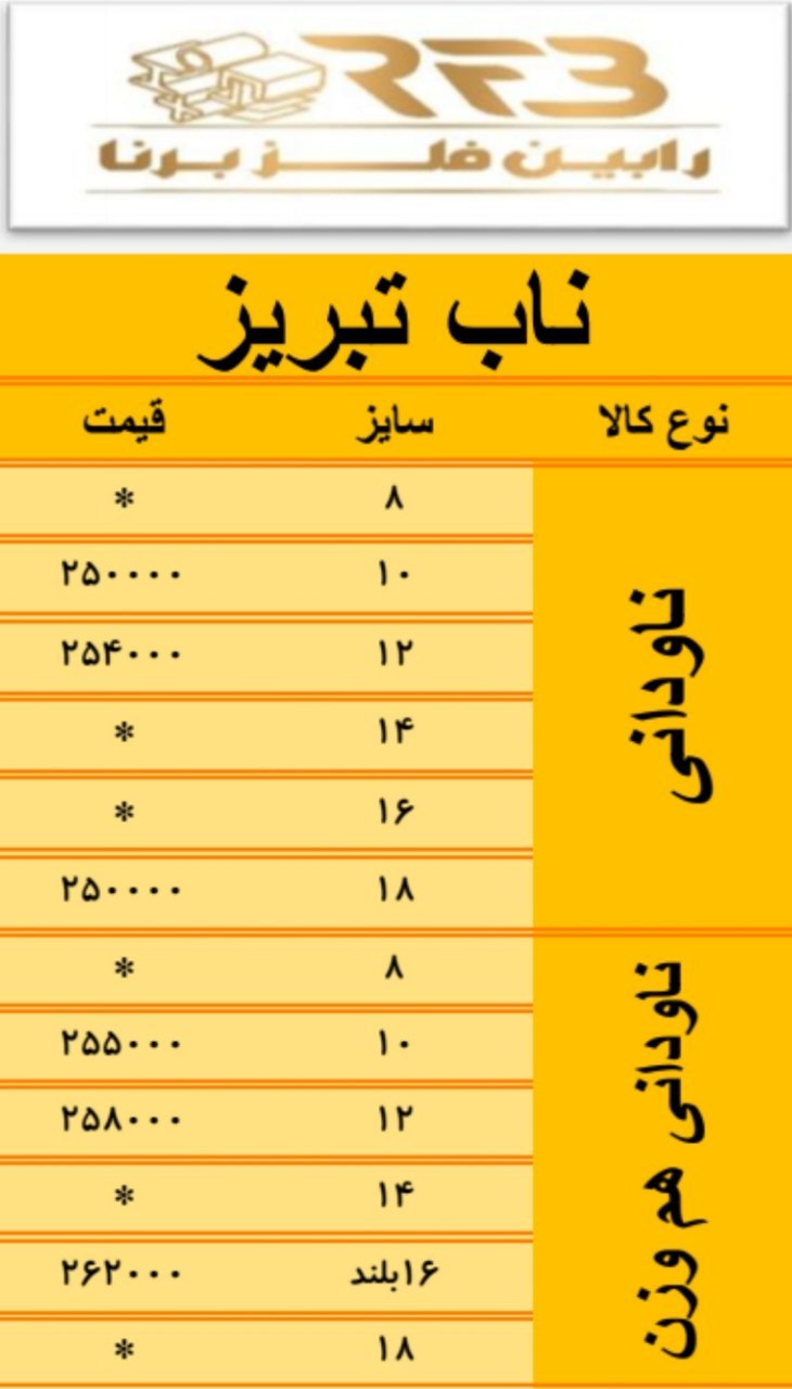 آرمان گستر اقتدار (آهن آرمان) 👈 ضمانت یک خرید مطمئن👉 #قیمت روز انواع #ناودانی #ناودانی_استاندارد #استاندارداروپا #استاندارد 🗓 چهارشنبه، 18 مرداد 1402 🗓 . 📢قیمت روز ناودانی استاندارد (اروپا) انبار تهران📢 🏭 طول 6 متری🏭 🔸 سایز 4 بال 20B (شاخه 17 کیلویی): 599.000 ریال 🔸 سایز 5 بال 25B (شاخه 23 کیلویی): 329.000 ریال 🔸 سایز 5 بال 38B (شاخه 33 کیلویی): 589.000 ریال 🔸 سایز 6.5 بال 42B (شاخه 42 کیلویی): 599.000 ریال ~~~~~~~~~~~~~~~~~ 🏭 طول 12 متری🏭 🔸 سایز 6.5 بال 42B (شاخه 85 کیلویی): 594.000 ریال 🔸 سایز 8 بال 45B (شاخه 104 کیلویی): 289.000 ریال 🔸 سایز 10 بال 50B (شاخه 127 کیلویی): 284.000 ریال 🔸 سایز 12 بال 55B (شاخه 160 کیلویی): 284.000 ریال 🔸 سایز 14 بال 60B (شاخه 192 کیلویی): 284.000 ریال 🔸 سایز 16 بال 65B (شاخه 225 کیلویی): 284.000 ریال 🔸 سایز 18 بال 70B (شاخه 264 کیلویی): 314.000 ریال 🔸 سایز 20 بال 75B (شاخه 303 کیلویی): 314.000 ریال 🔸 سایز 22 بال 80B (شاخه 352 کیلویی): 304.000 ریال 🔸 سایز 24 بال 85B (شاخه 398 کیلویی): 304.000 ریال 🔸 سایز 26 بال 90B (شاخه 454 کیلویی): 447.000 ریال 🔸 سایز 28 بال 95B (شاخه 500 کیلویی): 447.000 ریال 🔸 سایز 30 بال 100B (شاخه 550 کیلویی): 559.000 ریال 🔸 سایز 32 بال 100B (شاخه 714 کیلویی): 689.000 ريال 🔸 سایز 35 بال 100B (شاخه 720 کیلویی): ء call 🔸 سایز 38 بال 102B (شاخه 757 کیلویی): ء call 🔸 سایز 40 بال 110B (شاخه 860 کیلویی): 649.000 ريال ~~~~~~~~~~~~~~~~~ 📢قیمت روز ناودانی استاندارد (تولید داخل) انبار تهران📢 🏭 طول 6 متری🏭 🔸 سایز 5 (شاخه 22 کیلویی): 340.000 ریال 🔸 سایز 5 (شاخه 25کیلویی): ء call 🔸 سایز 6 (شاخه 24 کیلویی): 275.000 ریال 🔸 سایز 6 (شاخه 28 کیلویی): 275.000 ریال 🔸 سایز 8 (شاخه 32 کیلویی): 275.000 ریال 🔸 سایز 8 (شاخه 40 کیلویی): 270.000 ریال 🔸 سایز 10 (شاخه 39 کیلویی): 270.000 ریال 🔸 سایز 10 (شاخه 50 کیلویی): 270.000 ریال 🔸 سایز 12 (شاخه 53 کیلویی): call 🔸 سایز 12 (شاخه 61 کیلویی): 279.000 ریال 🔸 سایز 14 (شاخه 66 کیلویی): 279.000 ریال 🔸 سایز 14 (شاخه 73 کیلویی): 279.000 ریال 🔸 سایز 16 (شاخه 81 کیلویی): 279.000 ریال ~~~~~~~~~~~~~~~~~ 📢قیمت روز ناودانی استاندارد (تولید داخل) انبار تهران📢 🏭 طول 12 متری🏭 🔸 سایز 8 (شاخه 65 کیلویی): 279.000 ریال 🔸 سایز 8 (شاخه 80 کیلویی): 279.000 ریال 🔸 سایز 10 (شاخه 80 کیلویی): 279.000 ریال 🔸 سایز 10 (شاخه 100 کیلویی): 279.000 ریال 🔸 سایز 12 (شاخه 104 کیلویی): 279.000 ریال 🔸 سایز 12 (شاخه 122 کیلویی): 279.000 ریال 🔸 سایز 14 (شاخه 134 کیلویی): 279.000 ریال 🔸 سایز 14 (شاخه 146 کیلویی): 279.000 ریال 🔸 سایز 16 (شاخه 162 کیلویی): 279.000 ریال 🔸 سایز 18 (شاخه 192 کیلویی): 269.000 ریال 🔸 سایز 20 (شاخه 230 کیلویی): 372.000 ریال ~~~~~~~~~~~~~~~~~~ ☎️۰۲۱-۵۸۳۳۶ داخلی 115 خانم گل پرور 🌐www.ahanarman.com وب سایت @AhanArmanPrice🆔 کانال قیمت روز تلگرام