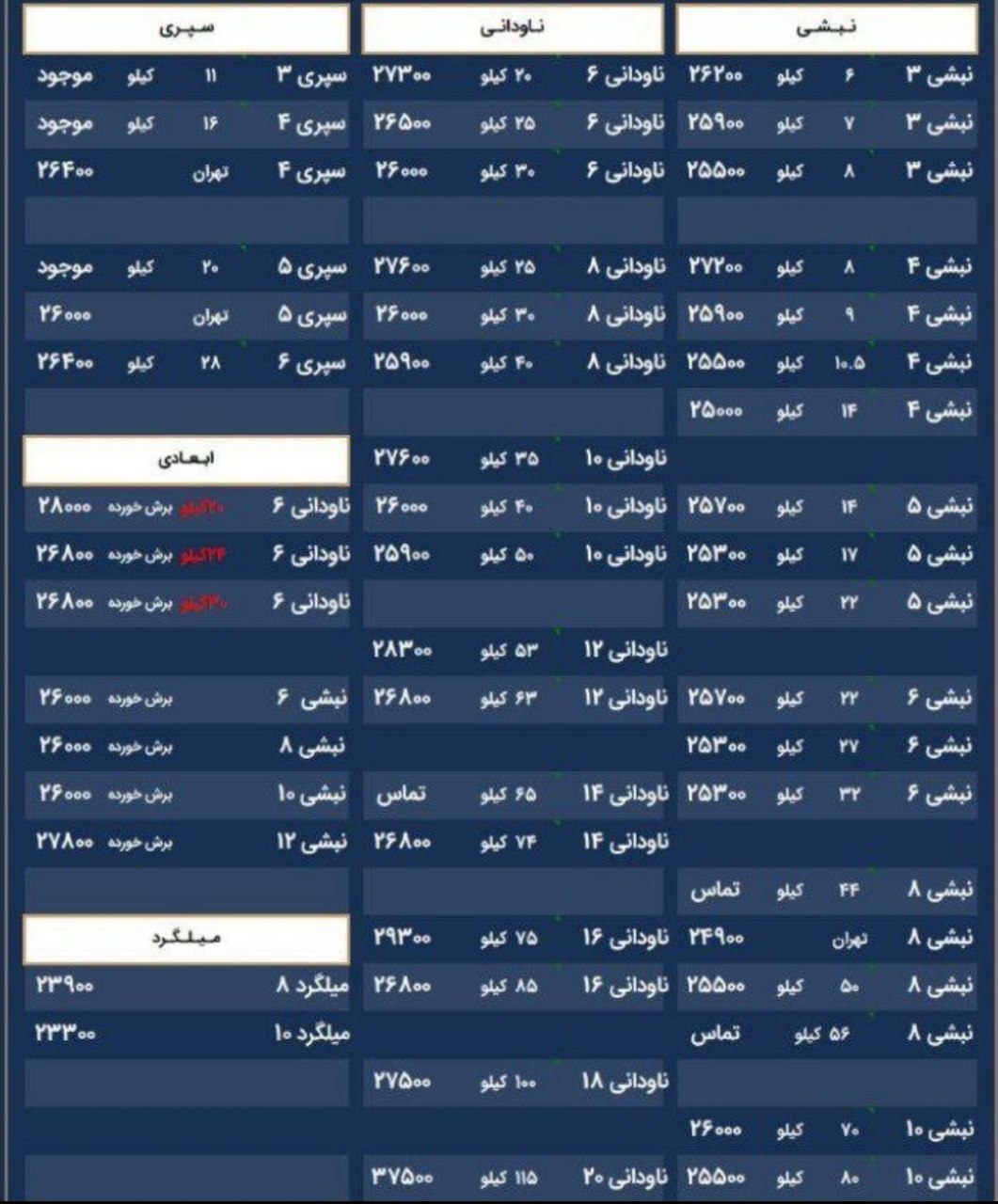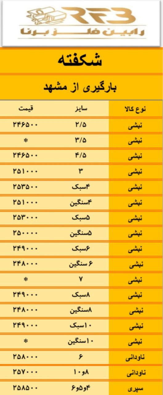 ((بسم الله الرحمن الرحیم))✅ #شرکت_آسیا_فولاد_امین🔵لیست نبشی و ناودانی🔵((انبار تهران))🔴1402/05/18🔴 #نبشی_سپهر🔶نشی ۳ گوشت ۲/۵ سپهر:📞#نبشی_آیهان🔶نشی ۳ گوشت ۲/۵ آیهان:📞#نبشي_اشتهارد🔶نبشي ٤ گوشت ۳ اشتهارد:📞🔶نبشی ۱۰ گوشت ۱۰ اشتهارد: 📞 #نبشی_پارسه🔶نبشی ۴ گوشت ۳ پارسه : 📞🔶نبشی ۴ گوشت ۴ پارسه : 📞#نبشی_ظهوریان🔶نبشی ۳ گوشت۳ ظهوریان:📞🔶نبشی ۴ گوشت ۳ ظهوریان:📞🔶نبشی ۵ گوشت ۳ ظهوریان:📞🔶نبشي ٨ گوشت ۷ ظهوریان: 📞#نبشی_شکفته🔶نبشی ۳ گوشت ۳ شکفته:📞#نبشی_آریان_فولاد🔶نبشی ۴ گوشت ۳ آریان فولاد:📞🔶نبشی ۴ گوشت ۴ آریان فولاد:📞🔶نبشی۵ گوشت ۴ آریان فولاد:📞🔶نبشی ۵ گوشت ۵ آریان فولاد:📞🔶نبشی ۶ گوشت ۵ آریان فولاد:📞🔶نبشی ۶ گوشت ۶ آریان فولاد:📞🔶نبشی ۷ گوشت ۷ آریان فولاد:📞🔶نبشی ۸ گوشت ۸ آریان فولاد:📞🔶نبشی ۱۰ گوشت ۱۰ آریان فولاد:📞🔶نبشی ۱۲ گوشت ۱۲ آریان فولاد:📞🔶نبشی ۱۵ گوشت ۱۵ آریان فولاد:📞 #نبشی_دهشير_يزد🔶نبشی ۱۰ گوشت ۱۰ دهشیر یزد:📞 #نبشي_لقمه 🔶نبشی لقمه ۸ * ٨ :📞🔶نبشي لقمه ١٠* ١٠ :📞