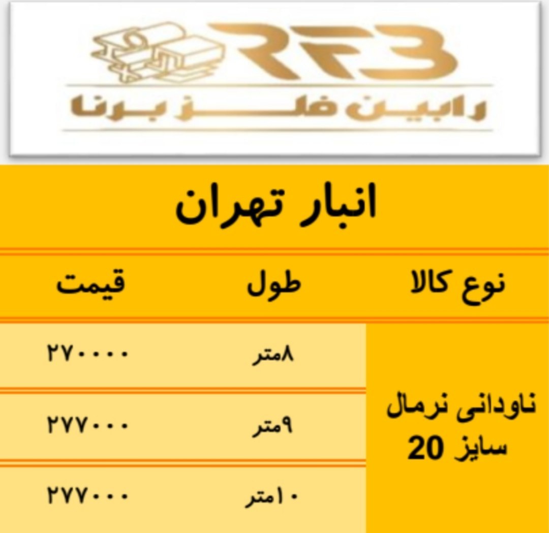 🔷موجودی ناودانی انبار تهران🔷🔹ناودانی ۴ فابریک اروپایی ( ۱۷ ك) .................................................. 🔹ناودانی ۵ اسپیرال ( ۲۳ ك) .................................................. 🔹ناودانی ۶ اسپیرال ( ۳۰ ك) 🔹ناودانی ۶ شکفته سنگین ( ۲۹ ك) 🔹ناودانی ۶ ف.تهران سبک ( ۲۳ ك ) .................................................. 🔹ناودانی ۸ شکفته سنگین ( ۴۳ ك) 🔹ناودانی ۸ ف.تهران سبک ( ۲۸ ك ) 🔹ناودانی ۸ سنگین فولاد.ت ( ۳۸ ك) 🔹ناودانی ۸ نستا سبک ( ۲۷ ك ) 🔹ناودانی ۸ نستا سنگین ( ۳۶ ك ) .................................................. 🔹ناودانی ۱۰ شکفته سنگین ( ۵۲ ك) 🔹ناودانی ۱۰ نصر تبریز سبک ( ۳۵ ك) 🔹ناودانی ۱۰ ف.تهران سبک ( ۳۷ ك) 🔹ناودانی ۱۰ ف.تهران سنگین ( ۴۸ ك) .................................................. 🔹ناودانی ۱۲ شکفته سنگین ( ۶۲ ك) 🔹ناودانی ۱۲ ناب تبریز ( ۶۰ ك) .................................................. 🔹ناودانی ۱۴ شکفته سنگین ( ۷۵ ك) 🔹ناودانی ۱۴ ناب تبریز ( ۷۵ ك) .................................................. 🔹ناودانی ۱۶ ناب تبریز ( ۸۴ ك) 🔹ناودانی ۱۶ شکفته سنگین ( ۸۵ ك) ..................................................🔹ناودانی ۶/۵ اروپایی 🔹ناودانی ۸ هم وزن اروپا 🔹ناودانی ۱۰ فابریک وزن اروپا 🔹ناودانی ۱۲ فابریک وزناروپا 🔹ناودانی ۱۲ هم وزن اروپا 🔹ناودانی ۱۴ فابریک اروپا 🔹ناودانی ۱۶ بلندهم وزن 🔹ناودانی ۱۸ هم وزن اروپا 🔹ناودانی ۲۰ هم وزن اروپا 🔹ناودانی ۲۲ فایکو سنگین 🔹ناودانی ۲۴ فایکو سنگین .................................................... ☎️ ۰۲۱-۵۵۵۳۴۲۲۹ 📱 ۰۹۱۲۰۲۳۷۱۲۲