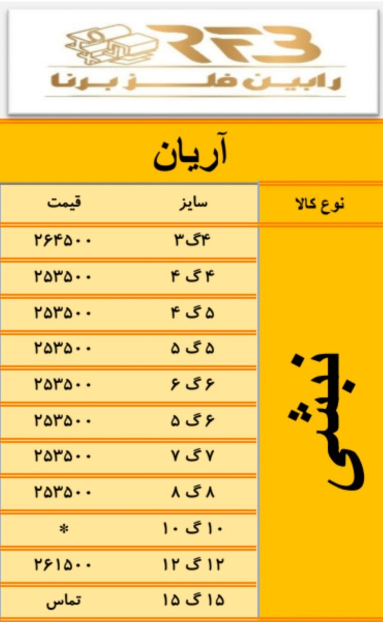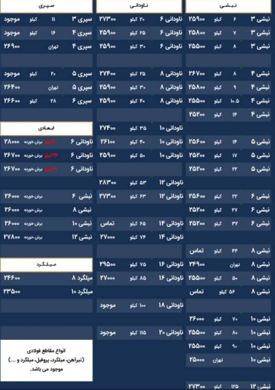 ﷽ ۱۸ / مرداد / ۱۴۰۲ 🗓▪️استعلام قیمت با تماس تلفنی▪️ 🔵موجودی نبشی انبار تهران🔹نبشی ۳ اسپیرال اصفهان ( ۸ ك) 🔹نبشی ۳ شکفته سنگین ( ۸ ك) 🔹نبشی ۳ آی هان تهران ( ۷ ك) 🔹نبشی ۳ سپهر ( ۷ ك) .................................................. 🔹نبشی ۴ اسپیرال اصفهان ( ۱۴ ك) 🔹نبشی ۴ شکفته ( ۱۰/۵ ك) 🔹نبشی ۴ فولاد پارسه ( ۹ ك) 🔹نبشی ۴ فولاد سپهر ( ۱۰ ك) 🔹نبشی ۴ ابهر ( ۱۴ ك) 🔹نبشی ۴ سپهر سنگین ( ۱۴ ك) .................................................. 🔹نبشی ۵ گ۳ سپهر ( ۱۵ ك) 🔹نبشی ۵ گ۵ زنجان ( ۲۲ ك) 🔹نبشی ۵ ناب تبریز ( ۲۲ ك) 🔹نبشی ۵ گ ۴ ناب تبریز ( ۱۸ ك) 🔹نبشی ۵ گ۴ زنجان ( ۱۸ ك) .................................................. 🔹نبشی ۶ زنجان ( ۳۱ ك) 🔹نبشی ۶ گ۴ زنجان ( ۲۳ ك) 🔹نبشی ۶ گ۵ زنجان ( ۲۷ ك) 🔹نبشی ۶ ناب تبریز ( ۳۲ ك) .................................................. 🔹نبشی ۷ آریان فولاد ( ۴۴ ك) 🔹نبشی ۷ ناب تبریز ( ۴۲ ك) .................................................. 🔹نبشی ۸ آریان فولاد ( ۵۶ ك) 🔹نبشی ۸ فولاد اشتهارد ( ۵۶ ك) 🔹نبشی ۸ گ۷ شکفته ( ۵۰ ك) .................................................. 🔹نبشی ۱۰ شکفته ( ۸۰ ك) 🔹نبشی ۱۰ آریان فولاد ( ۸۸ ك) 🔹نبشی۱۰ اشتهارد ( ۸۶ ك) 🔹نبشی۱۰ گ۸ اشتهارد ( ۷۵ ك) .................................................. 🔹نبشی ۱۲ آریان فولاد ( ۱۳۳ ك) 🔹نبشی ۱۲ مگا استیل ( ۱۲۹ ك) .................................................. 🔹نبشی ۹ آریان فولاد (بلند) 🔹نبشی ۱۴ آریان فولاد (بلند) 🔹نبشی ۱۵ آریان فولاد (بلند) 🔹نبشی ۲۰ آریان فولاد (بلند) .................................................. موجودی سپری انبار تهران🔹سپری ۳ نورد آسمان ( ۱۰ ك) 🔹سپری ۴ نوردآسمان ( ۱۵ ك) 🔹سپری ۴ شکفته ( ۱۵ ك) 🔹سپری ۵ نورد آسمان ( ۲۰ ك ) 🔹سپری ۵ شکفته ( ۲۱ ك) 🔹سپری ۶ نورد آسمان ( ۲۶ ك) 🔹سپری ۶ شکفته ( ۲۵ ك)