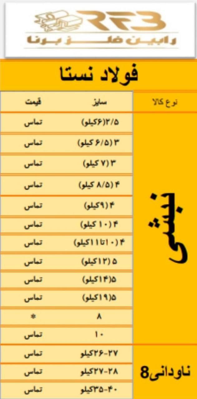 اعلام موجودی نبشی آراد فولاد اذربایجان #فولاد_اشتهارد🔸نبشی ۳×۴: 📞 🔸نبشی۲/۵×۴: 📞 🔸نبشی ۸×۸ : 📞 🔸نبشی ۸بلند: 📞 🔸نبشی۱۰×۱۰: 📞 🔸نبشی ۹×۱۰: 📞 🔸نبشی ۸×۱۰: 📞 🔸نبشی۷×۱۰: 📞 🔸نبشی۱۰×۱۰لقمه: 📞 🔸نبشی۸×۸ لقمه:📞