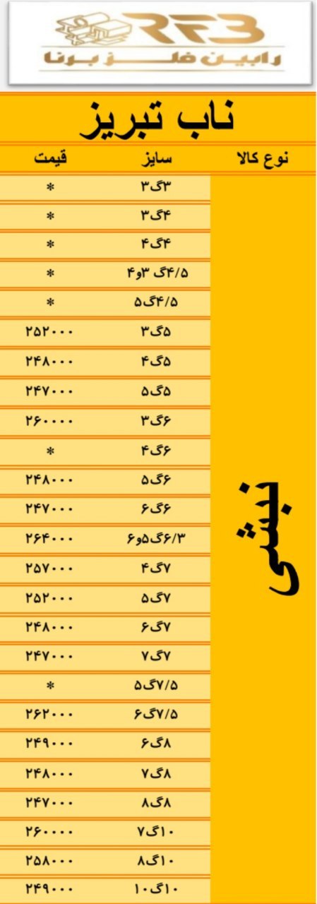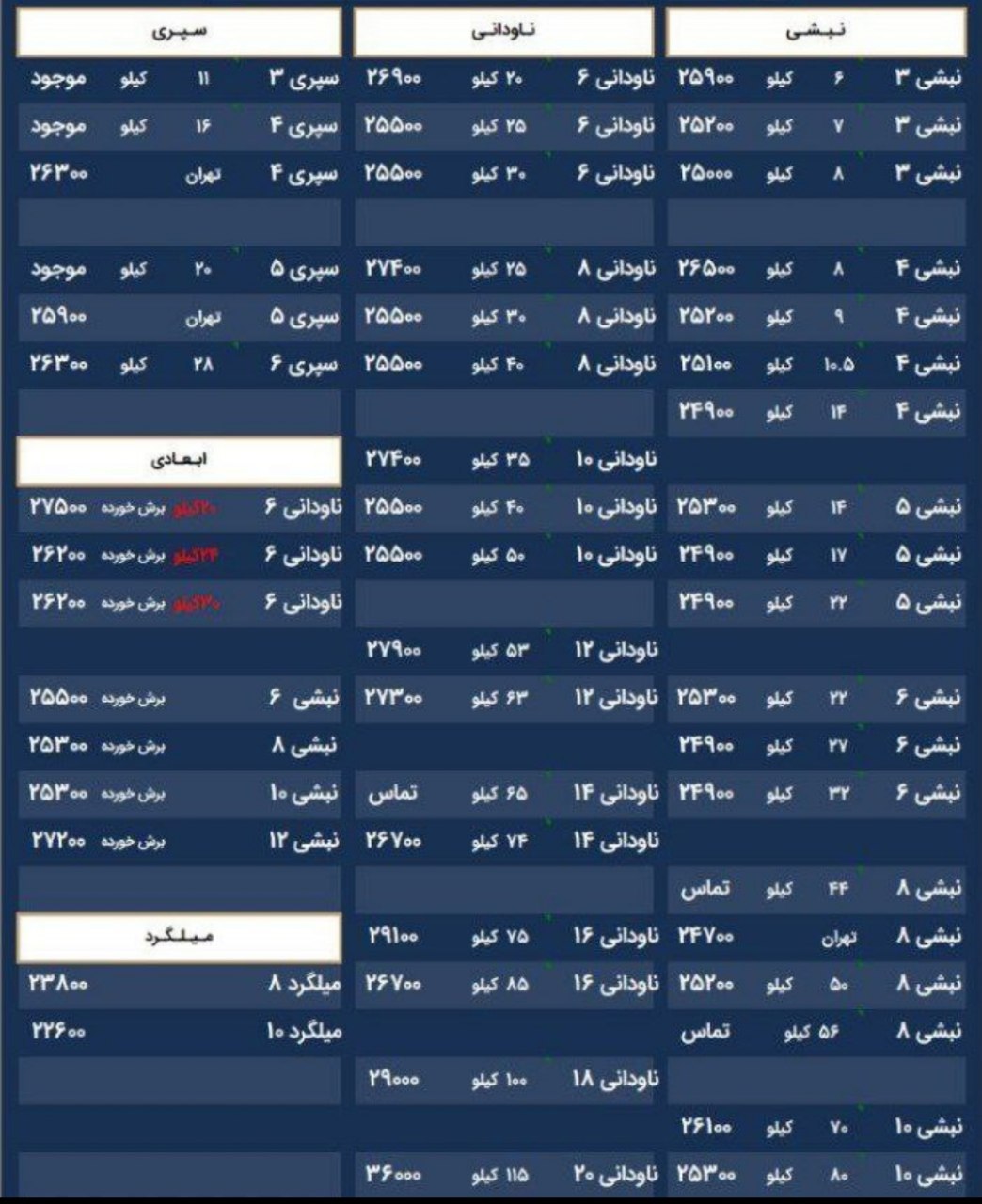 اعلام موجودی ناودانی آراد فولاد اذربایجان #فولاد_نستی 🔸ناودانی ۸(۲۶-۲۵)…… 🔸ناودانی ۸(۲۷-۲۶) ۰۰۰۰۰۰ 🔸ناودانی ۸(۲۸-۲۷)…. 🔸ناودانی۸(۴۰-۳۵):🔸نبشي ۲/۵ ….. 🔸نبشی ۳سبک… 🔸نبشی ۳معمولی…… 🔸نبشی ۴ ……. 🔸نبشی ۴ (۸/۵)…… 🔸نبشی ۴ (۹کیلو)…. 🔸نبشی ۴ (۱۰کیلو)….. 🔸نبشی ۴ (۱۱کیلو): 🔸نبشی۲/۵* ۵ : 🔸نبشی۳*۵: 🔸نبشی۴*۵….. 🔸نبشی ۸*۸….. 🔸نبشی ۱۰*۱۰……. 🔸سپری۵ …..