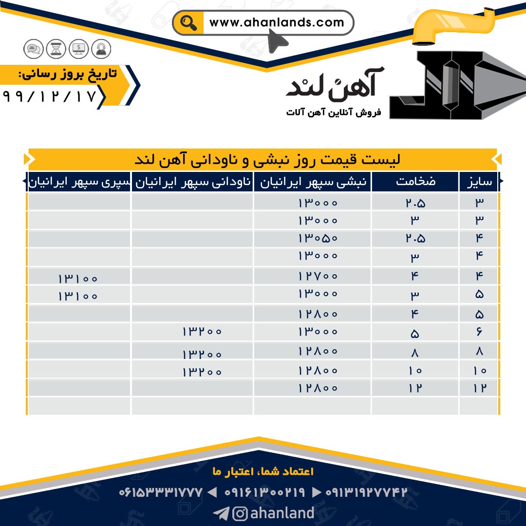 🔴آهن لند🔴 ⭕لیست قیمت انواع محصولات فولادی در تاریخ: 1399/12/17برای مشاهده آنلاین قیمت انواع مقاطع فولادی به وب سایت WWW.AHANLANDS.COM مراجعه فرمایید. ⚜اعتماد شما اعتبار ماست⚜ ارتباط با کارشناسان ما: ☎️۰۶۱۵۳۳۳۱۷۷۷ 📱۰۹۱۳۱۹۲۷۷۴۲ 📱۰۹۱۶۱۳۰۰۲۱۹ 📍آدرس تلگرام آهن لند @ahanlandss 📍آدرس اینستاگرام آهن لند https://www.instagram.com/ahanland/?hl=en