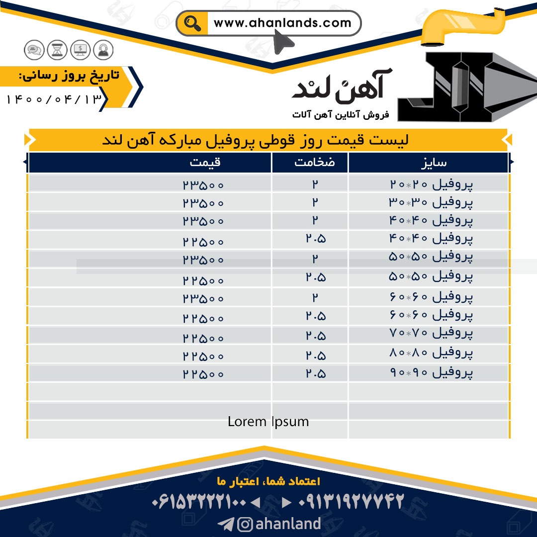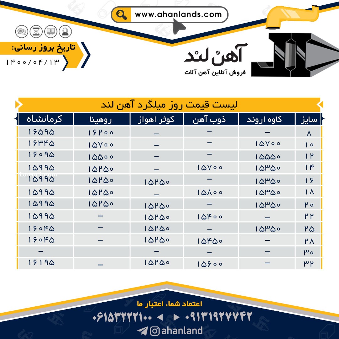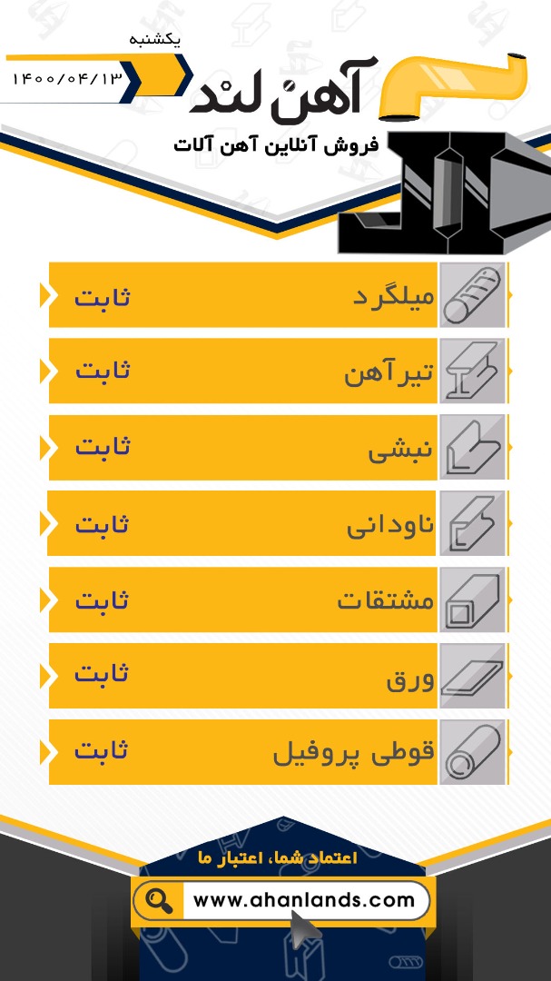 🔴آهن لند🔴 لیست قیمت سیزدهم تیرماه 1400 برای مشاهده آنلاین قیمت انواع مقاطع فولادی به وب سایت زیر مراجعه نمایید: WWW.AHANLANDS.COM ⚜اعتماد شما اعتبار ماست⚜ ارتباط با کارشناسان ما: https://zil.ink/ahanland 📍آدرس اینستاگرام آهن لند https://lnkd.in/d4epHFt
