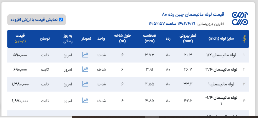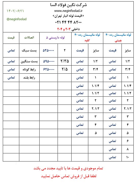 لوله "1/2 ضخامت 2 میل ⬅️ 37000 تومان لوله "3/4 ضخامت 2 میل ⬅️ 37000 تومان لوله "1 ضخامت 2 میل ⬅️ 37000 تومان لوله "11/4 ضخامت 2 میل ⬅️ 37000 تومان لوله "11/2 ضخامت 2 میل ⬅️ 37000 تومان لوله " 2 ضخامت 2 میل ⬅️ 37000 تومان لوله 2/30 و 2/50 ض 3 میل ⬅️ 36000 تومان